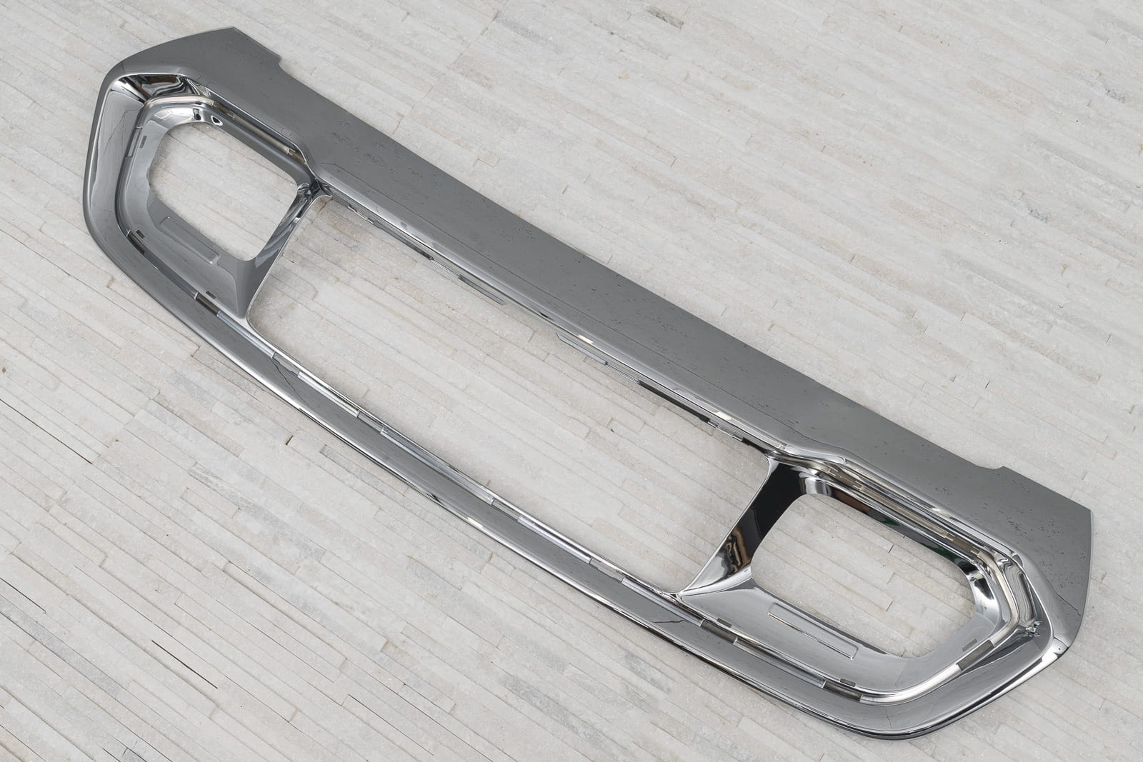 Chromowana nakładka / listwa dolnej kratki przedniego zderzaka, dedykowana dla JEEP GRAND CHEROKEE IV (WK2) 2017-2021 (wersja po drugim facelfitingu). Pasuje do wersji LAREDO, LIMITED, TRAILHAWK, OVERLAND.
