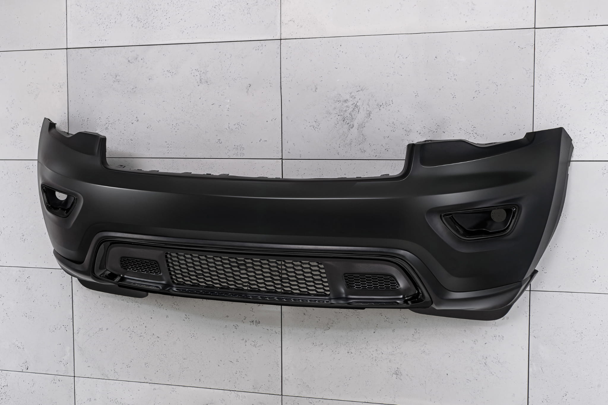 Kompletny zderzak przedni, dedykowany dla JEEP GRAND CHEROKEE IV (WK2) 2017-2021 (wersja po drugim faceliftingu). Wersja bez otworów pod czujniki parkowania PDC i bez otworów pod spryskiwacze. Pasuje do wersji LAREDO, LIMITED, OVERLAND i TRAILHAWK.
