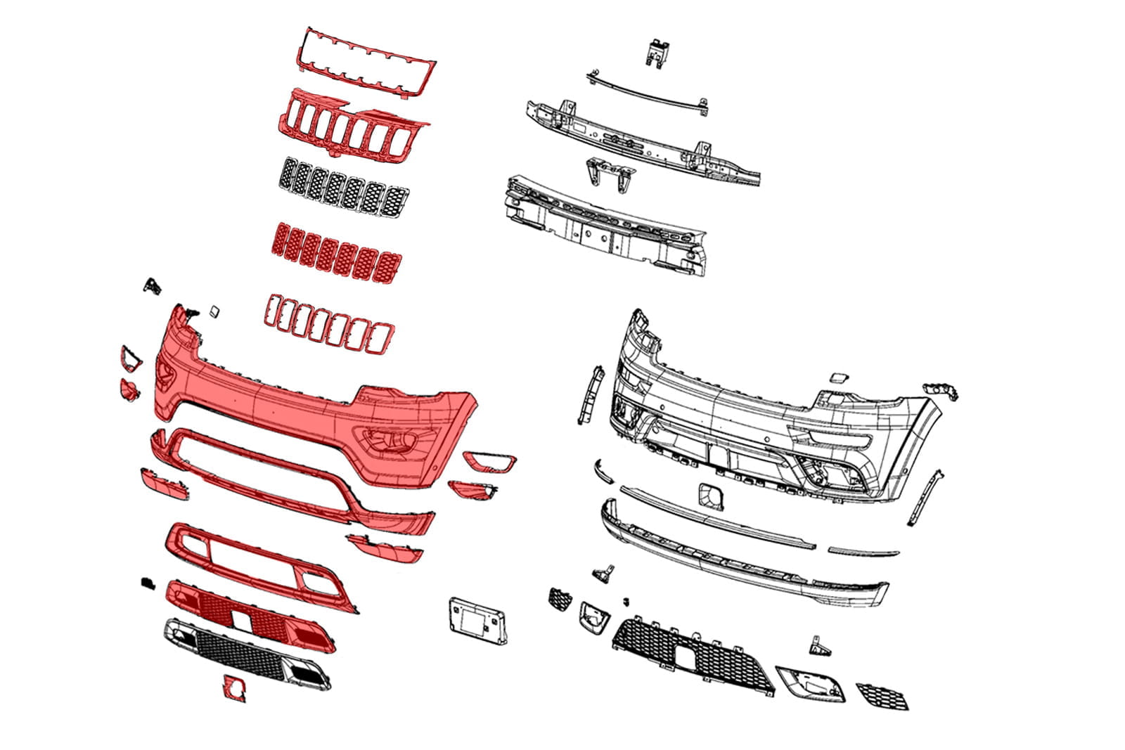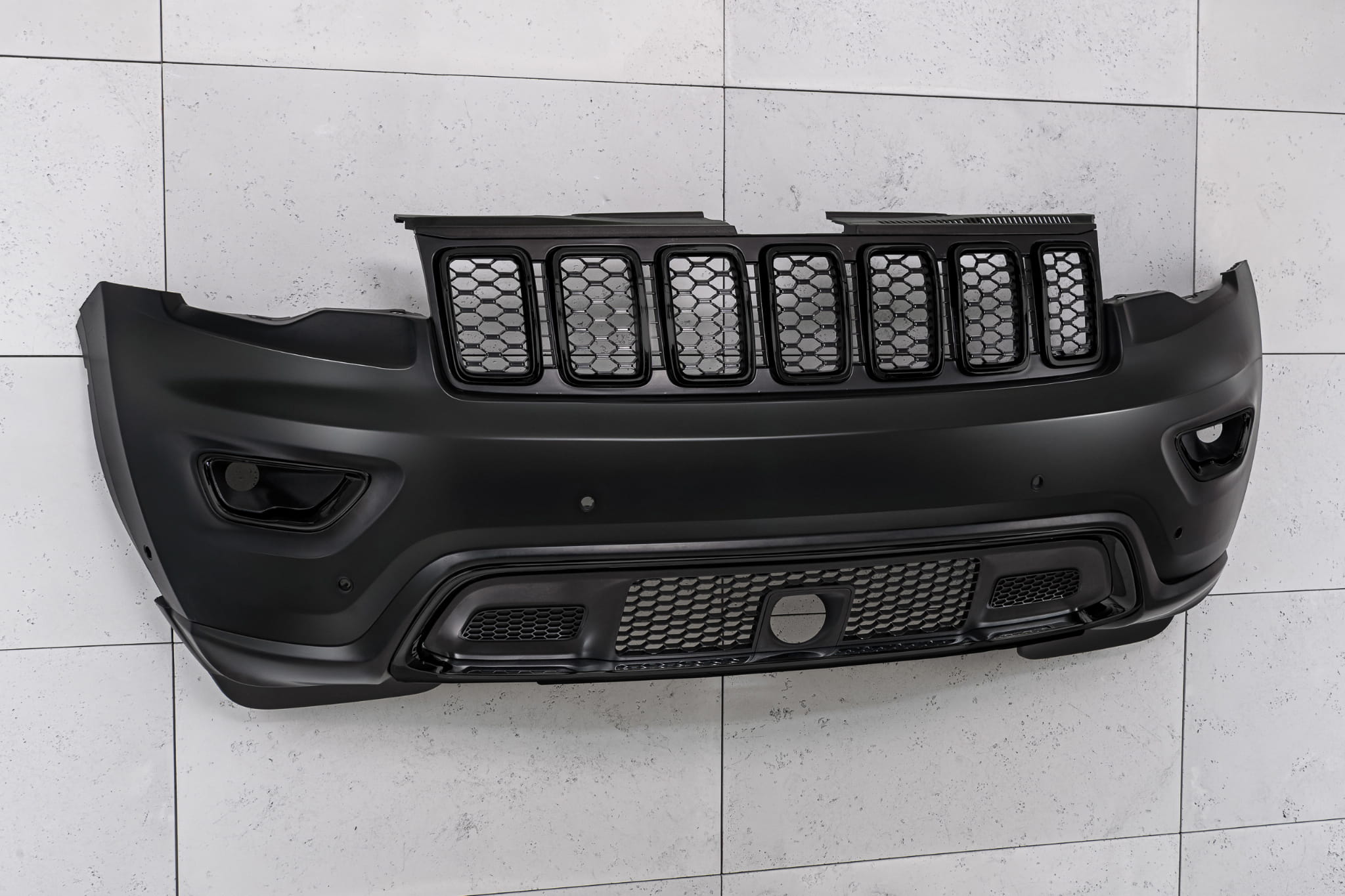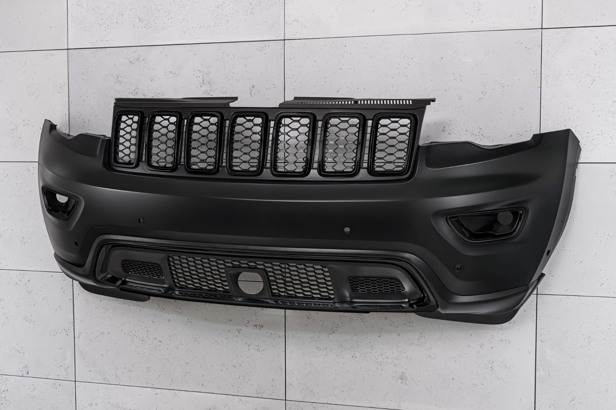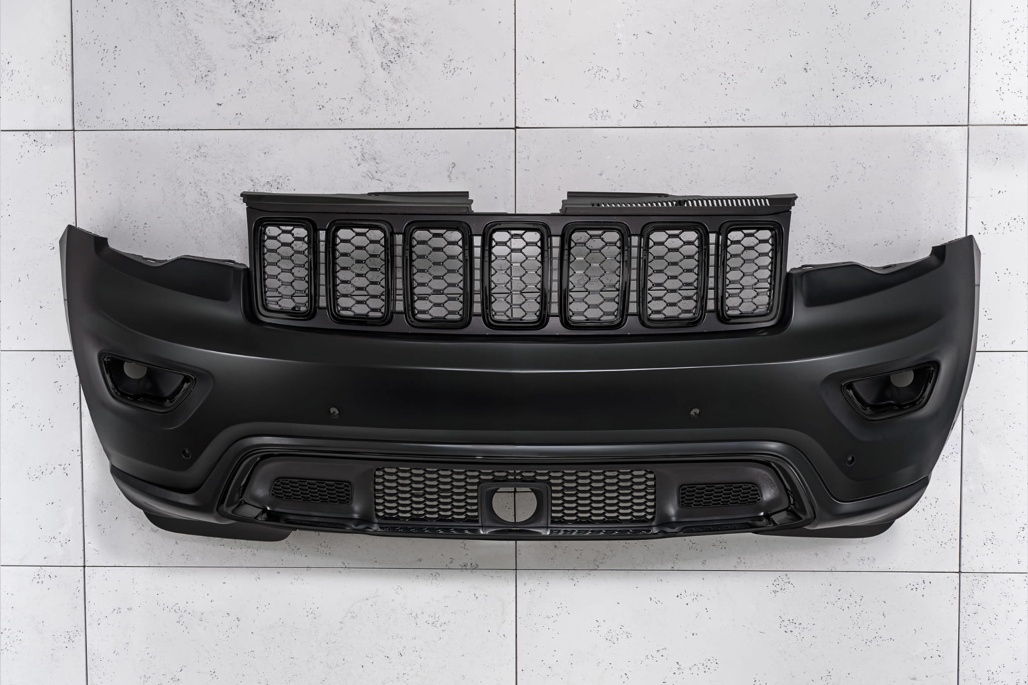 Kompletny zderzak przedni z czarnym grillem, dedykowany dla JEEP GRAND CHEROKEE IV (WK2) 2017-2021 (wersja po drugim faceliftingu). Wersja z otworami pod czujniki parkowania PDC i bez otworów pod spryskiwacze. Pasuje do wersji LAREDO, LIMITED, OVERLAND i TRAILHAWK. Produkt posiada otwór pod radar - aktywny tempomat (ACC).