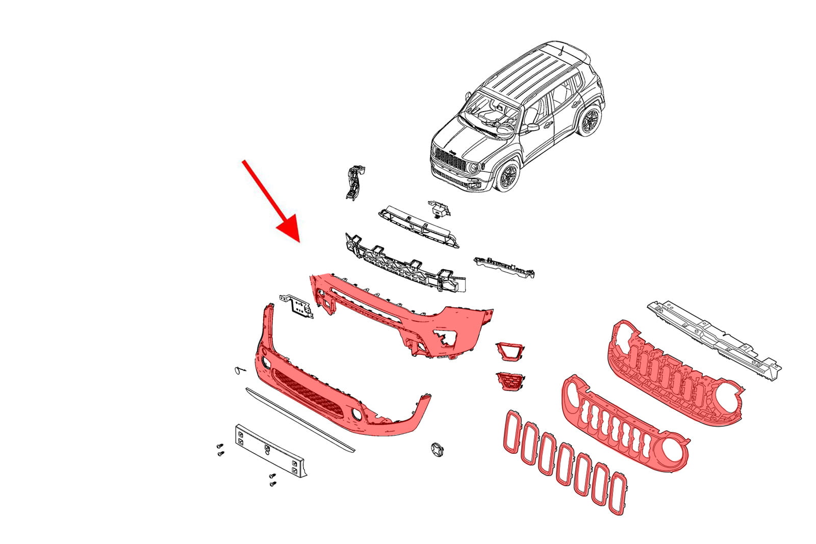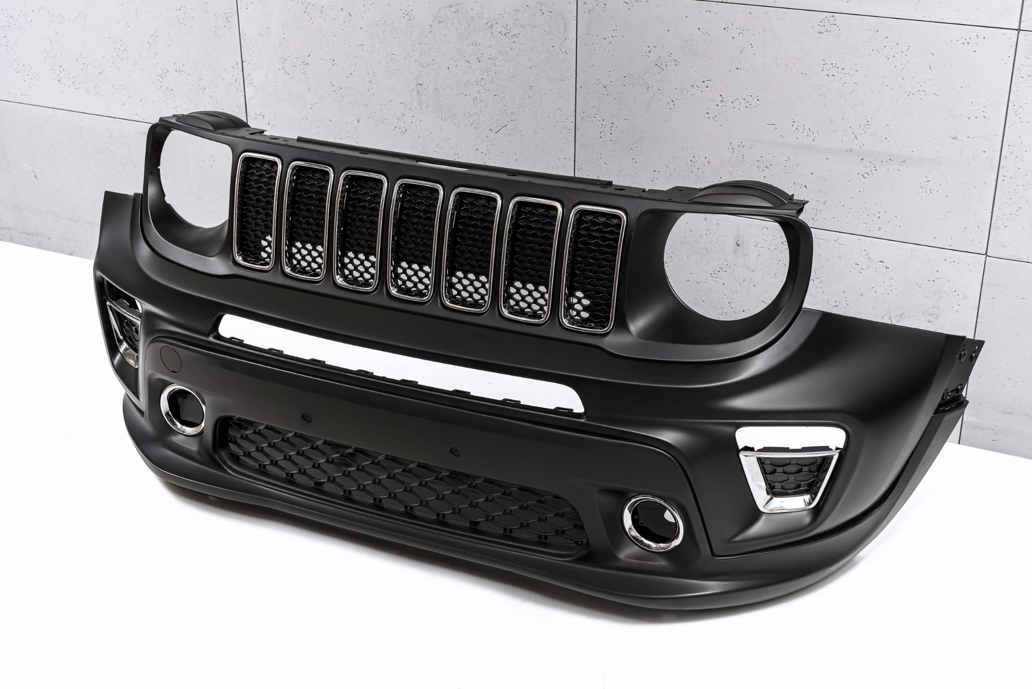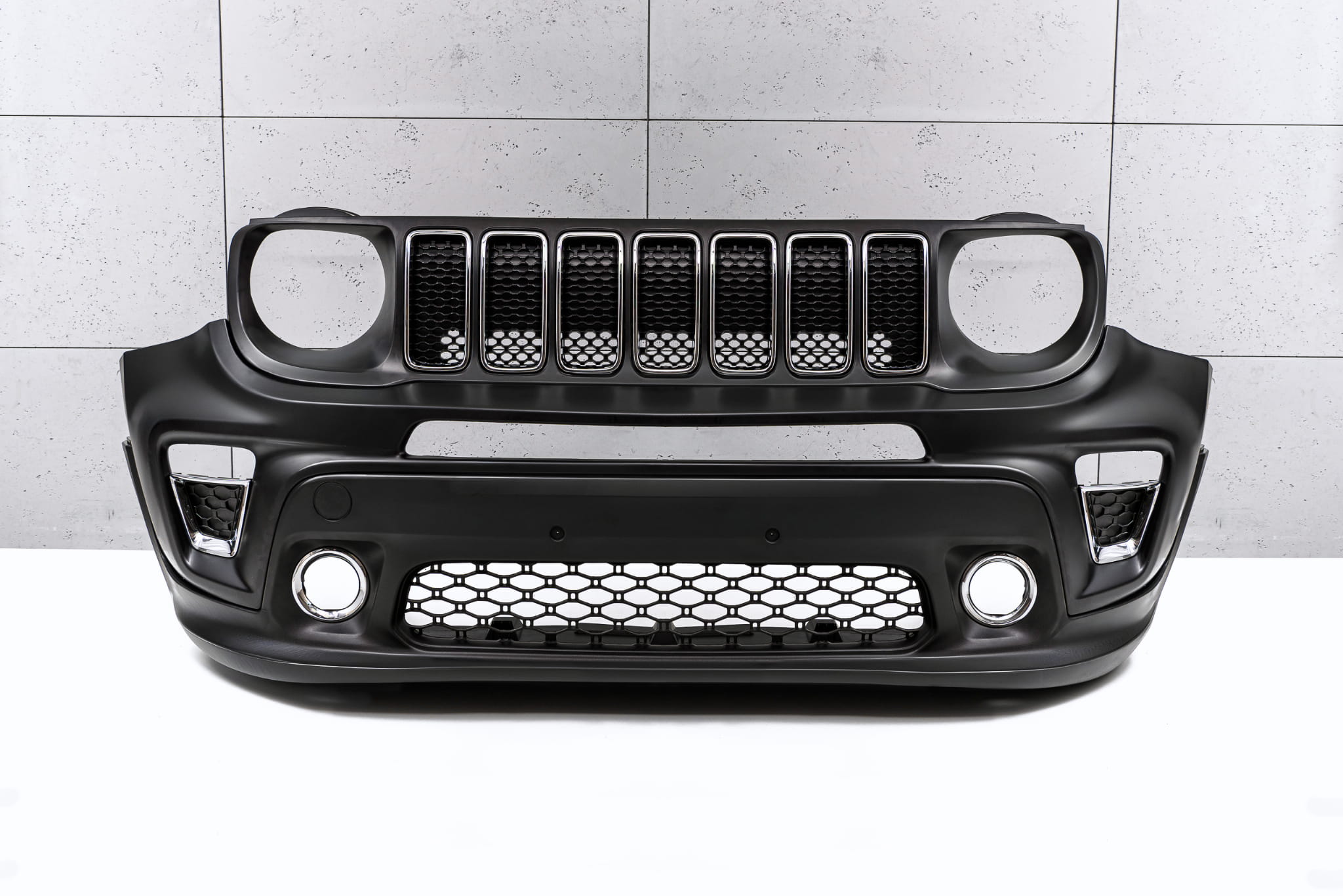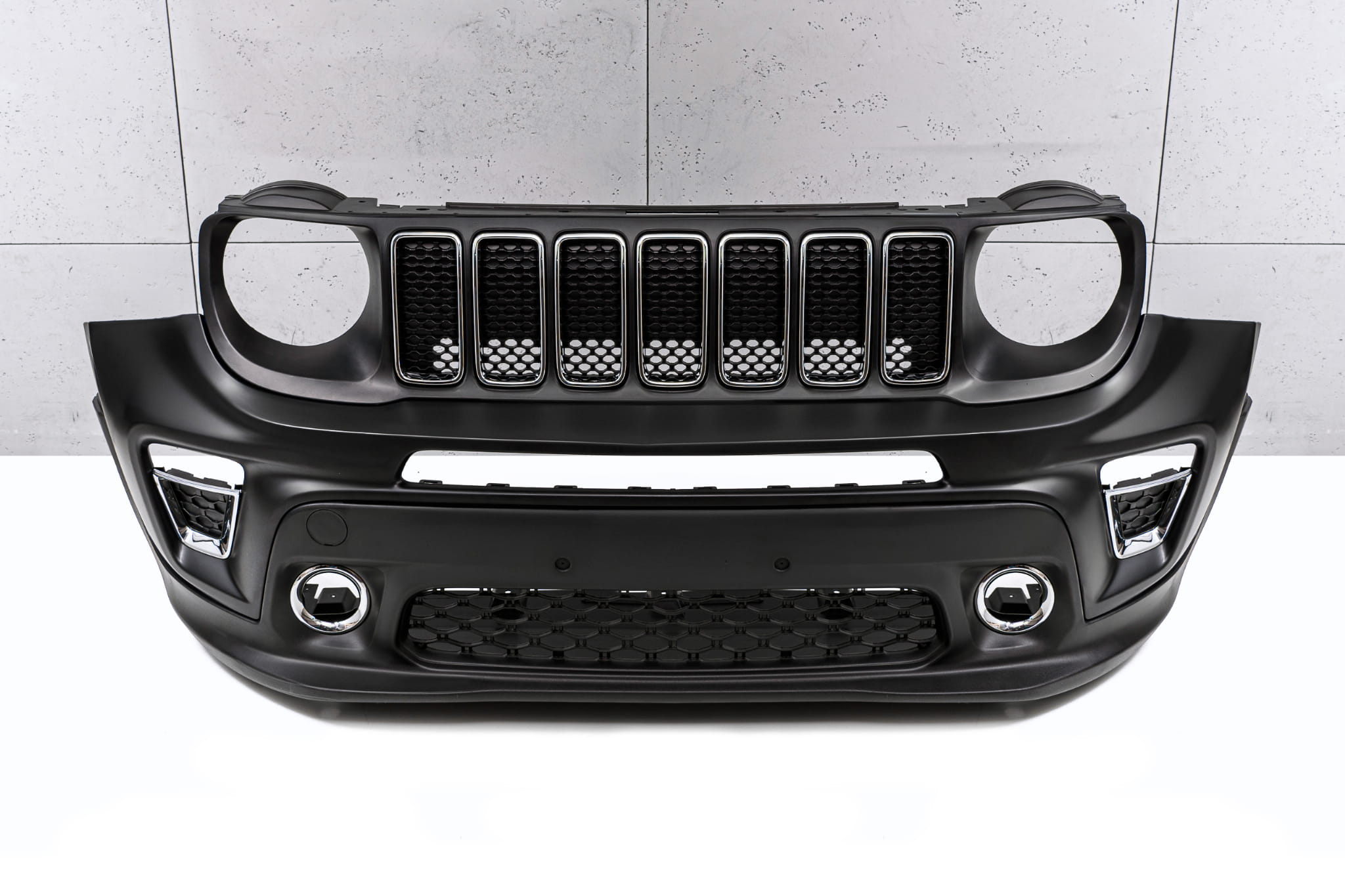 Kompletny zderzak przedni z grillem, dedykowany dla JEEP RENEGADE I (BU) 2018-2022 (wersja po faceliftingu).