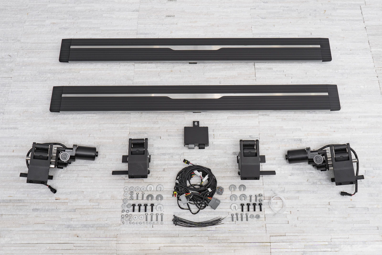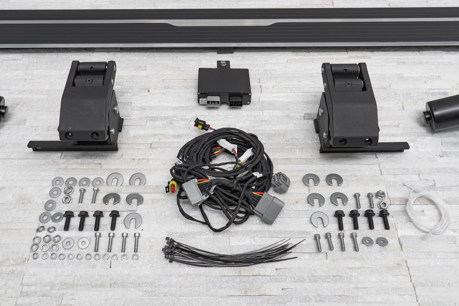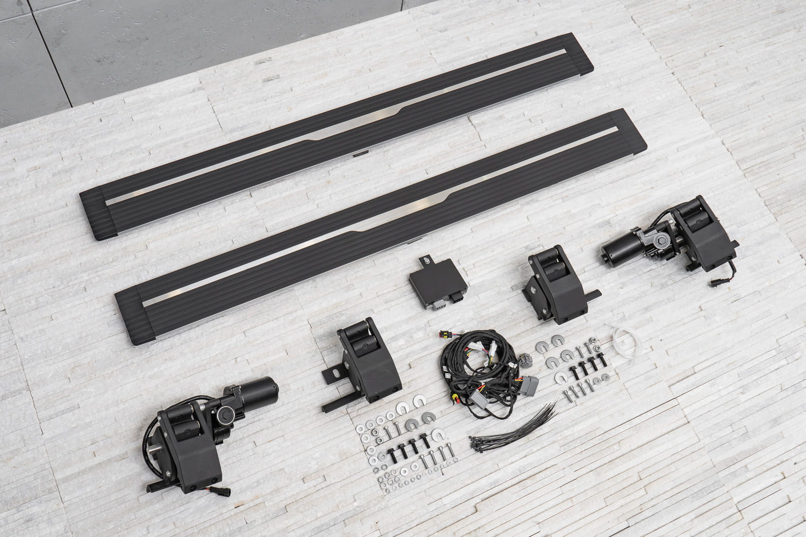 Stopnie zaprojektowano w sposób uniemożliwiający przytrzaśnięcie nogi (zatrzymują się napotykając na opór przy chowaniu się). W pozycji złożonej, progi nie zmniejszają prześwitu. Produkt nowy, zapakowany w pudełko. W zestawie komplet stopni bocznych (lewy i prawy), cztery silniki, elementy montażowe oraz instrukcja.