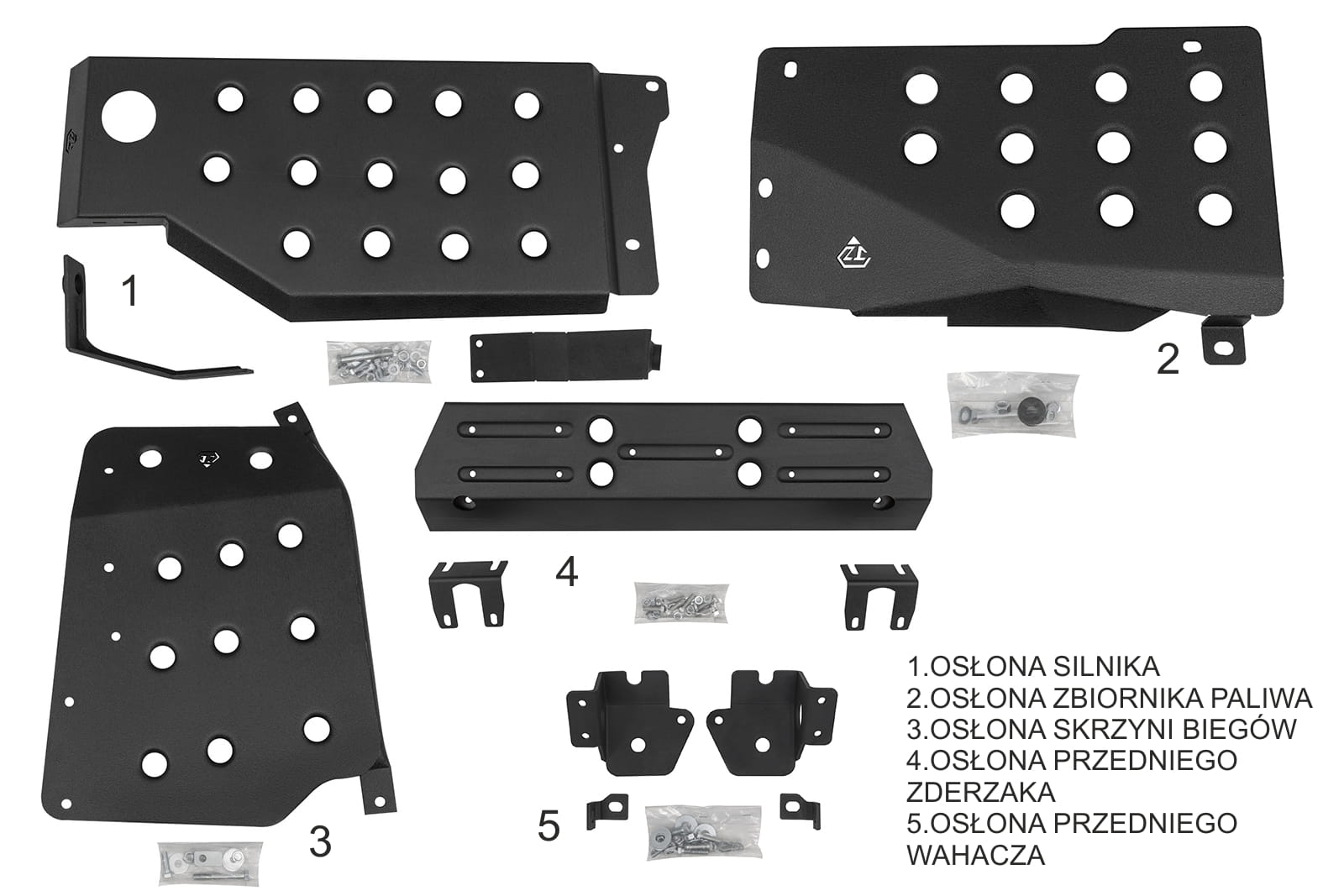 Oferowany zestaw stanowi kompleksową ochronę przed uszkodzeniem podwozia naszego samochodu, w szczególności silnika oraz skrzyni biegów, zwłaszcza w trakcie jazdy w terenie. Wytrzymały zestaw osłon jest nieodzownym elementem wyposażenia samochodu każdego miłośnika off-roadu. Dedykowane osłony pełnią rolę ochronną, ograniczając ryzyko mechanicznego uszkodzenia silnika, skrzyni biegów samochodu czy wahacza przez kamienie itp. Osłony pasują do wahaczy standardowych i regulowanych. Jednocześnie osłony są tak zaprojektowane, że po zamontowaniu nadal mamy wygodny dostęp do wahacza, więc przy rutynowej konserwacji, nie ma potrzeb ich demontowania. Produkty zostały wykonane ze stali walcowanej na zimno o grubości 3 mm, zabezpieczonej w dwustopniowym procesie malowania z użyciem wstępnej warstwy epoksydowej. Tak powstała struktura zapewnia nie tylko trwałość, ale także estetyczny wygląd elementu przez długi czas. Osłony montowane są w fabrycznie przygotowane dla nich miejsca w podwoziu Wranglera. Nie wymagają wiercenia.