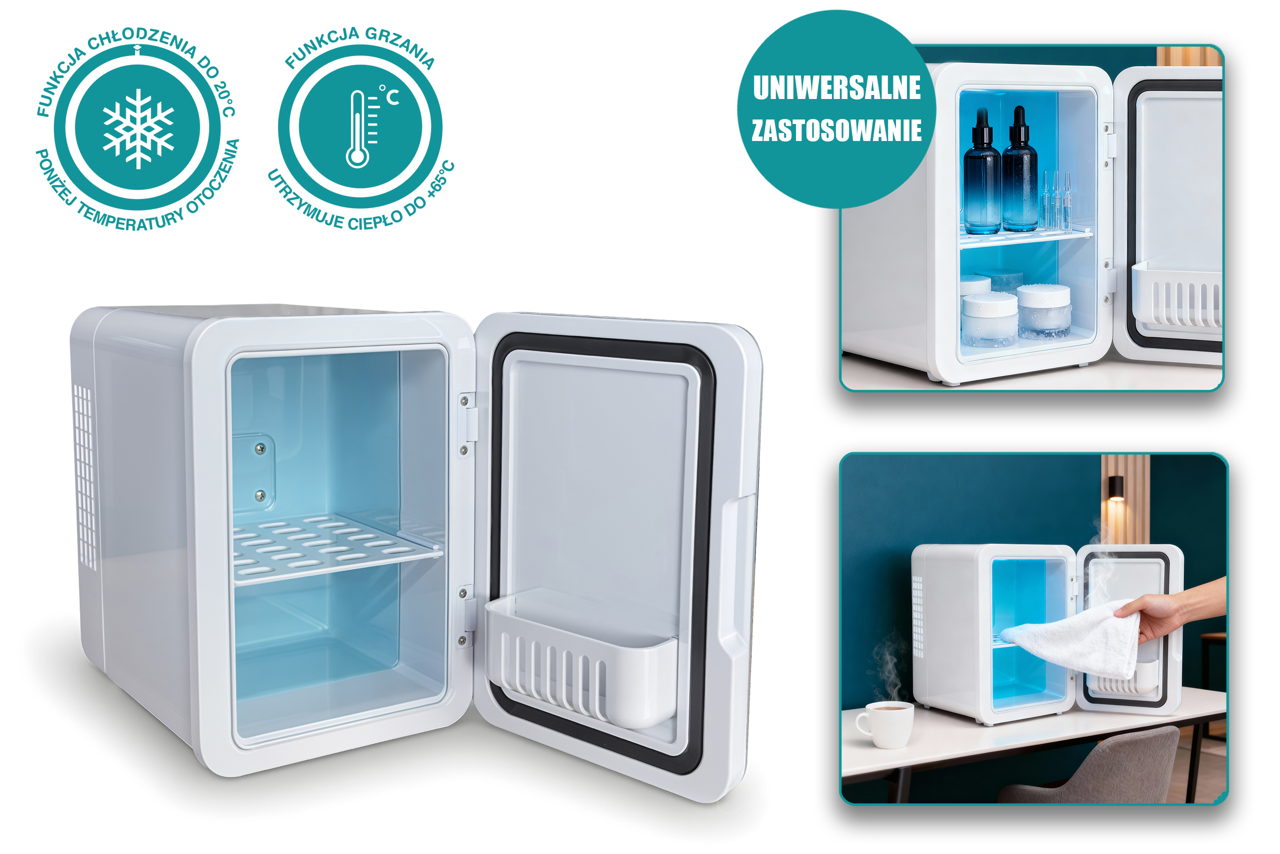 Lodówkę możesz używać w domu, salonie i w trasie, bo działa zarówno z gniazdka AC 220–240 V, jak i z samochodowego DC 12 V. Tryb ciepła ułatwia przygotowanie kompresów przed zabiegiem, a kompaktowa, 4-litrowa konstrukcja pracuje cicho i w technologii bezfreonowej. Całość dopełnia elegancka, biała obudowa, która świetnie pasuje do każdego wnętrza.