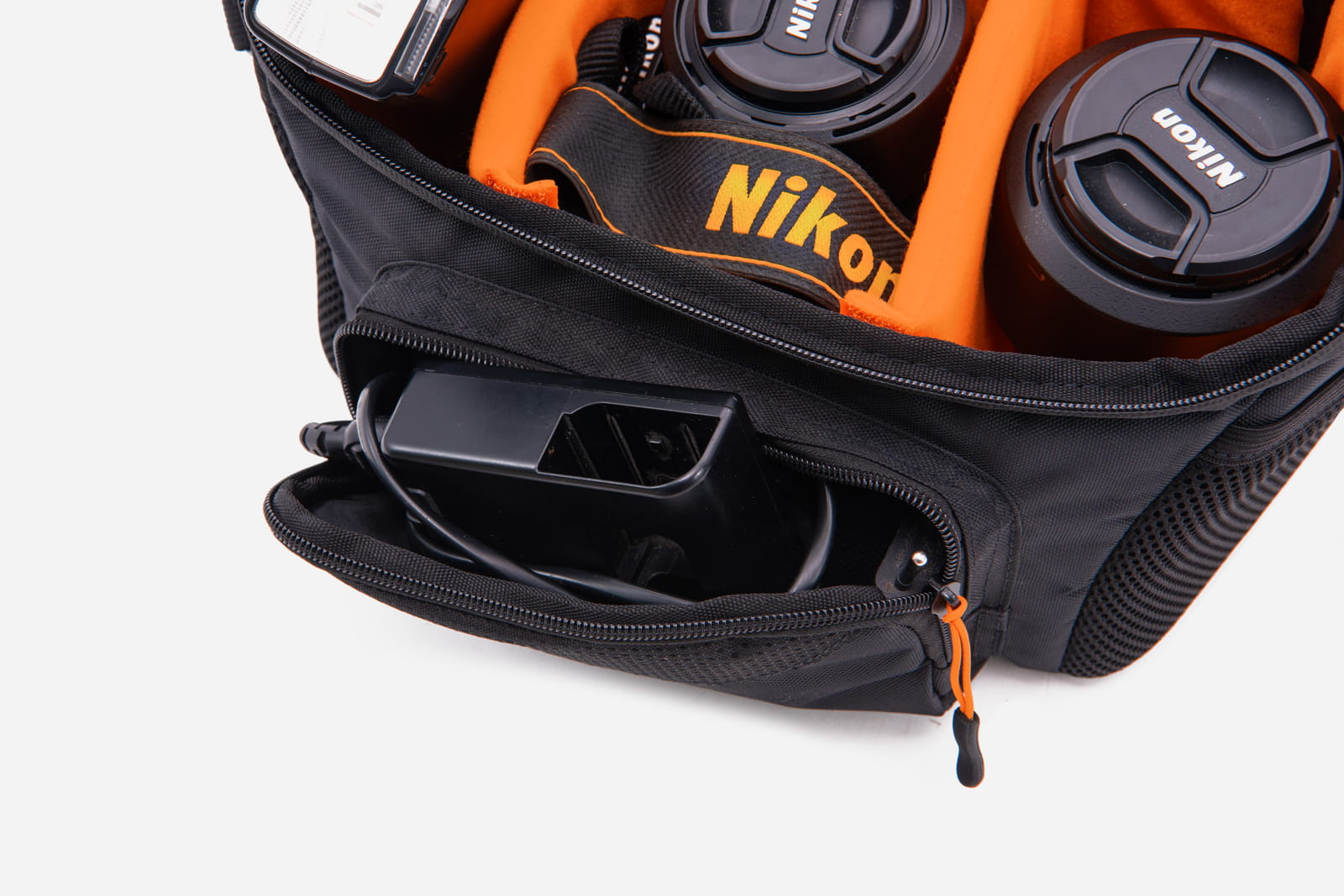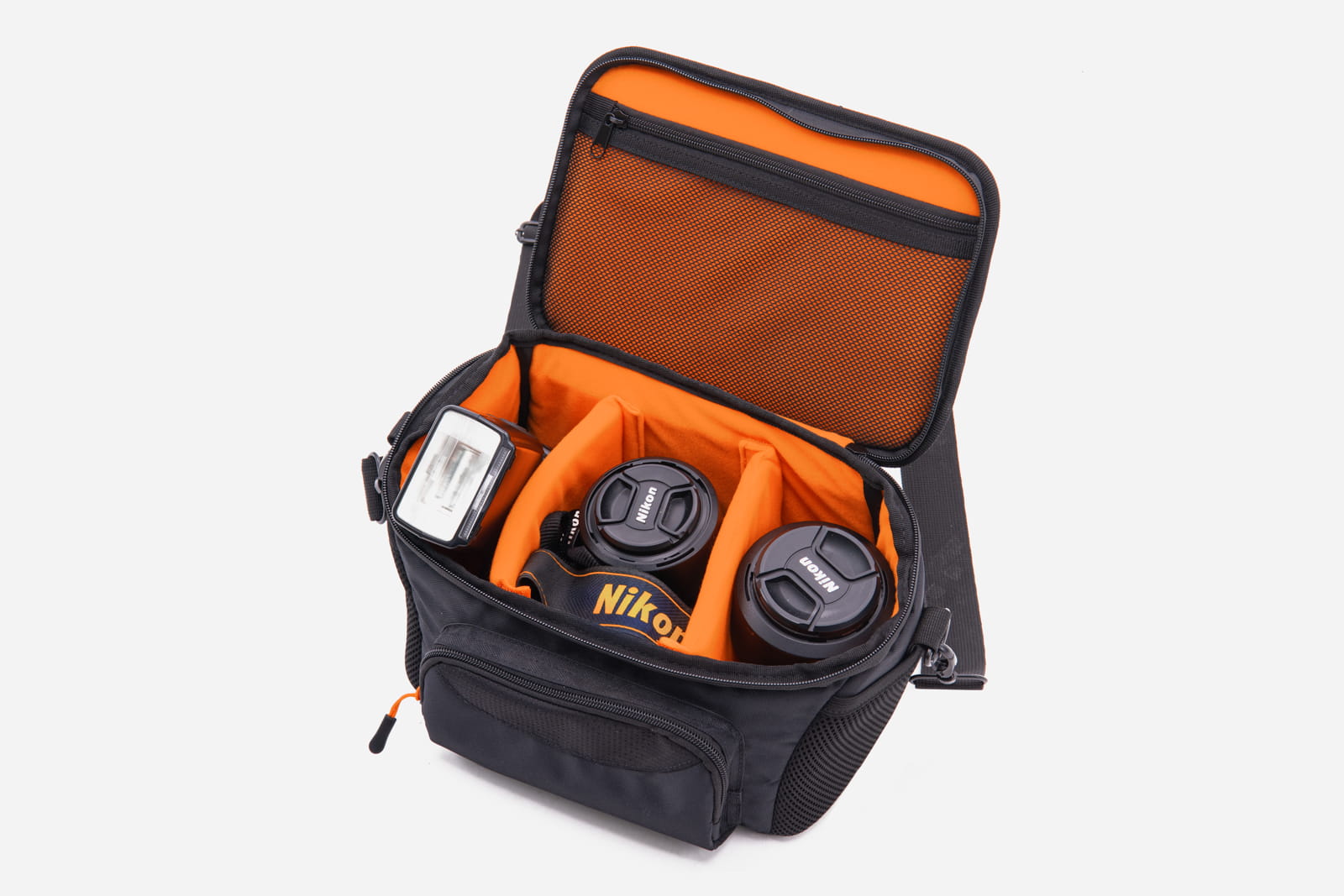 Modna torba na aparat fotograficzny z wodoodporną osłoną przeciwdeszczową, paskiem do przenoszenia i przegródkami na akcesoria. Wnętrze torby wyposażone jest w wygodne przegródki, w których można schludnie spakować aparat, dodatkowy obiektyw, akcesoria, baterie i karty pamięci. Po stronie zewnętrznej umieszczono kieszeń zasuwaną na zamek błyskawiczny, z miejscem na karty pamięci, elastyczne boczne kieszonki na drobiazgi oraz regulowany pasek na ramię.