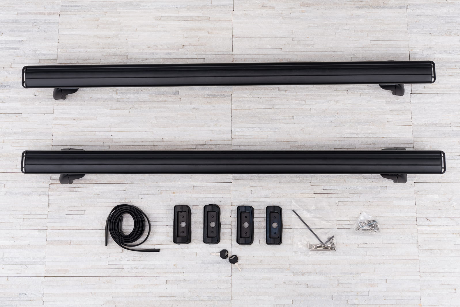 Produkt fabrycznie nowy, oryginalnie zapakowany, w kolorze srebrnym. W komplecie znajdują się: dwie belki, dwa kluczyki oraz klucz imbusowy.