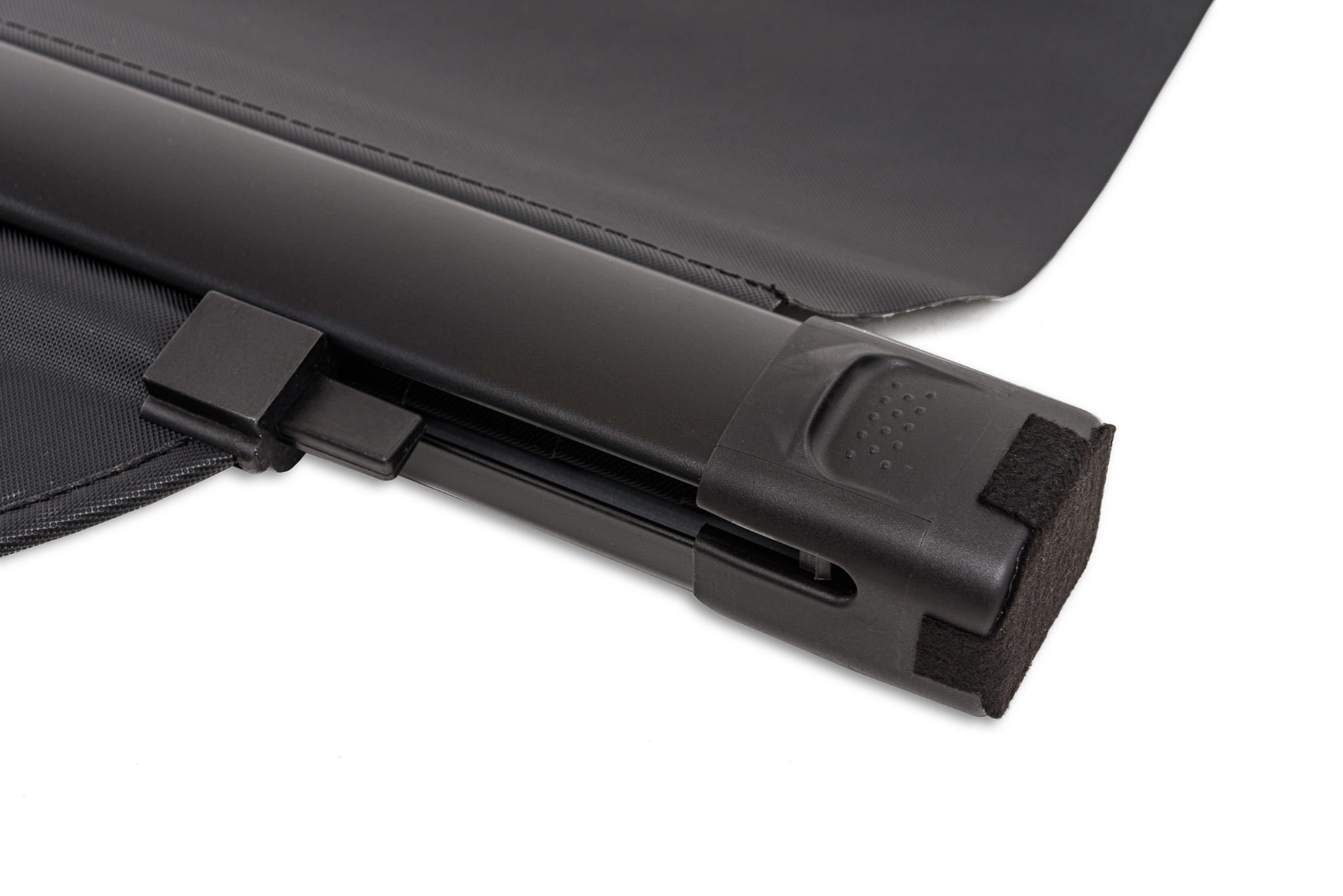 Zastosowanie składanej rolety pozwala chronić przestrzeń bagażową przed nadmiernym nasłonecznieniem. Osłania ona także zawartość bagażnika, zmniejszając tym samym ryzyko kradzieży znajdujących się wewnątrz przedmiotów. Elegancki czarny kolor oraz estetyka wykonania sprawiają, że roleta doskonale współgra ze stylem samochodu. Poszycie zasłony wykonane zostało z materiału odpornego na uszkodzenia oraz odbarwienia spowodowane nasłonecznieniem i zmianami temperatur, dzięki czemu produkt doskonale prezentuje się przez długi czas.