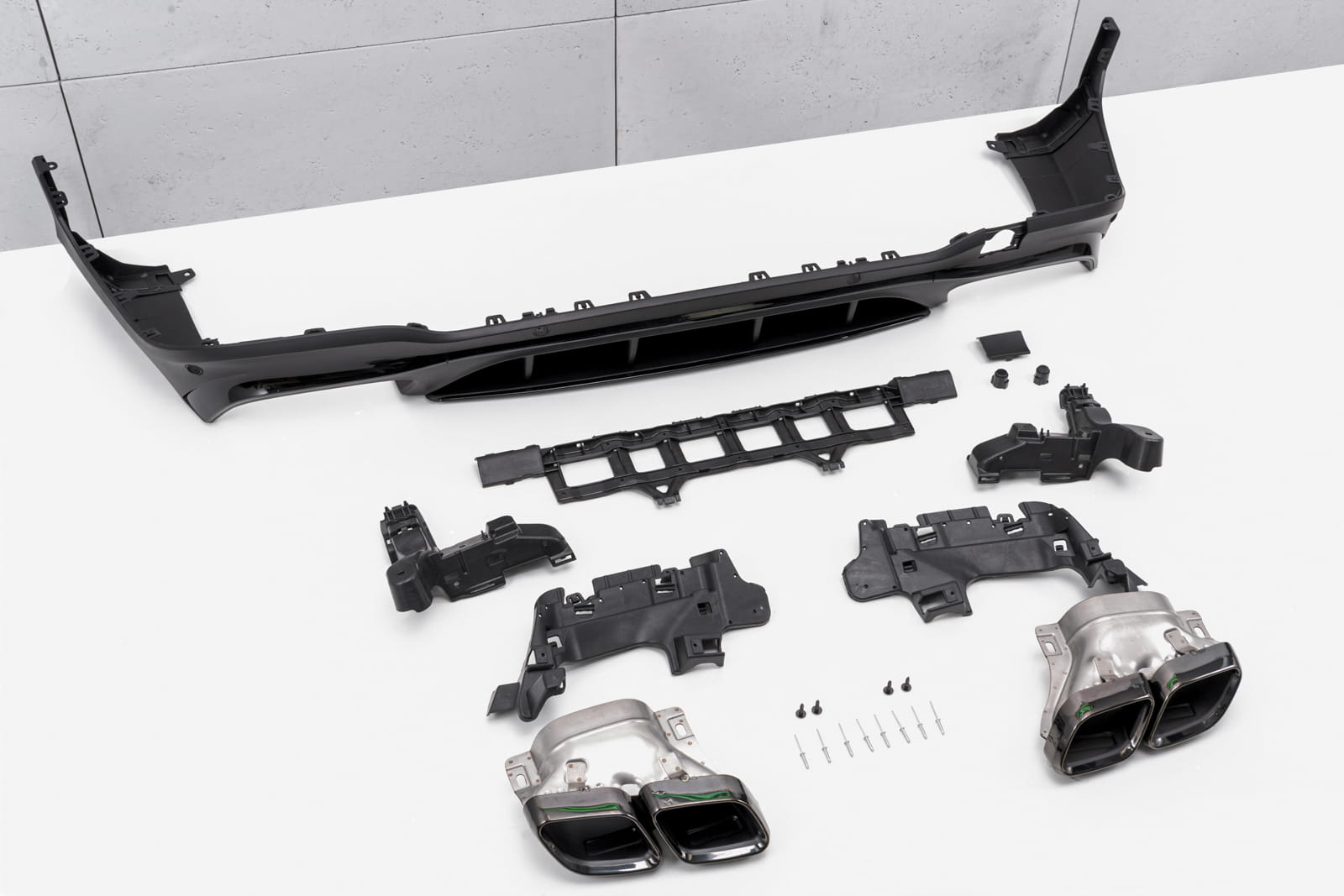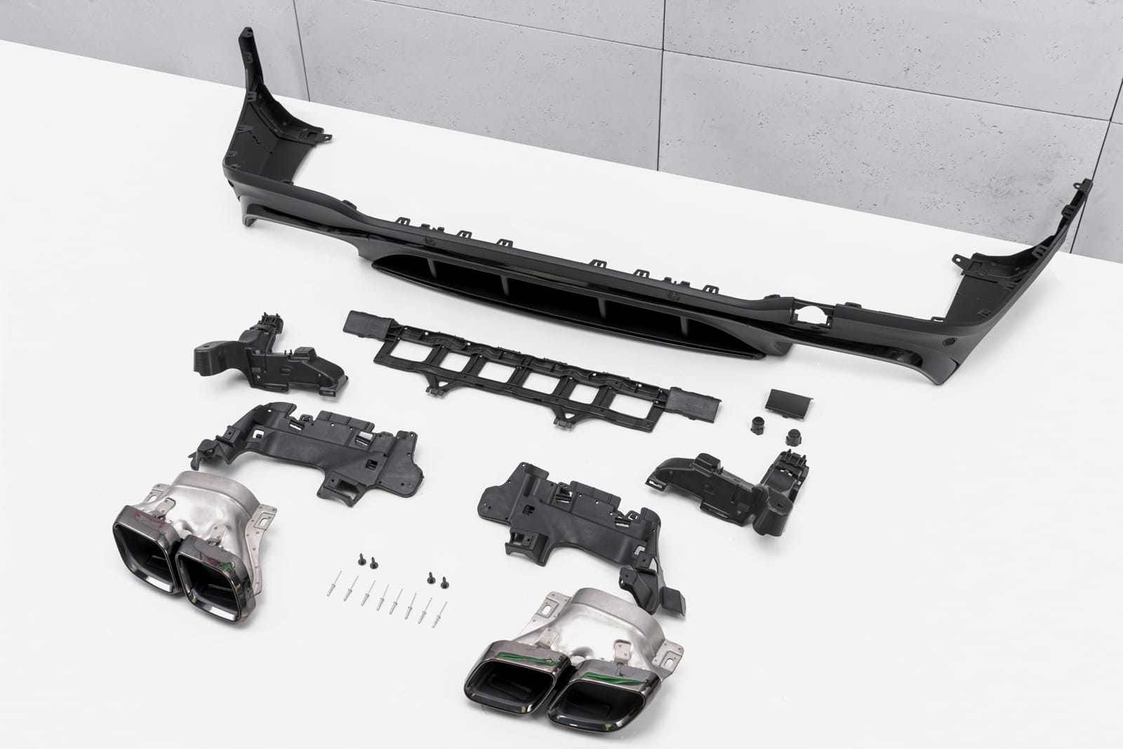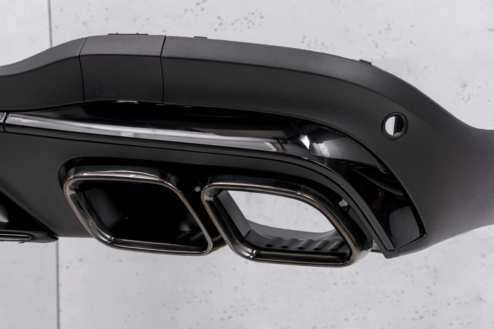 Zestaw stylizujący zaprojektowany został w stylu charakterystycznym dla samochodów z linii AMG. Prawdziwym atutem zestawu, są sportowe końcówki wydechu wykonane ze stali nierdzewnej. Dyfuzor i ozdobne końcówki wydechu wykonano z najwyższej jakości tworzywa motoryzacyjnego w kolorze Piano Black. Zestaw zachwyca sportowym charakterem, a połysk czarnych elementów dodaje mu elegancji - dzięki czemu doskonale współgra z imponującym designem MERCEDESA GLC.