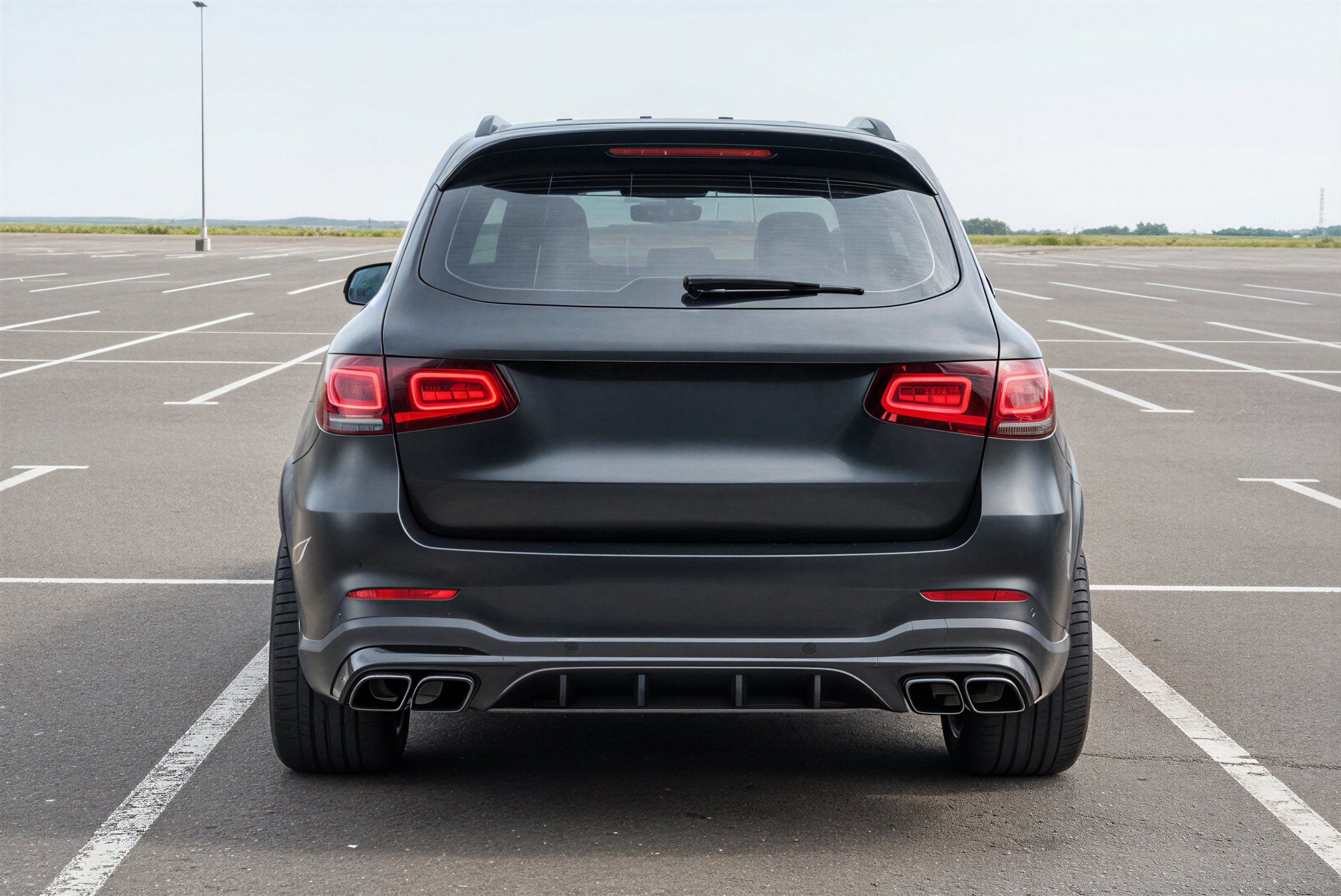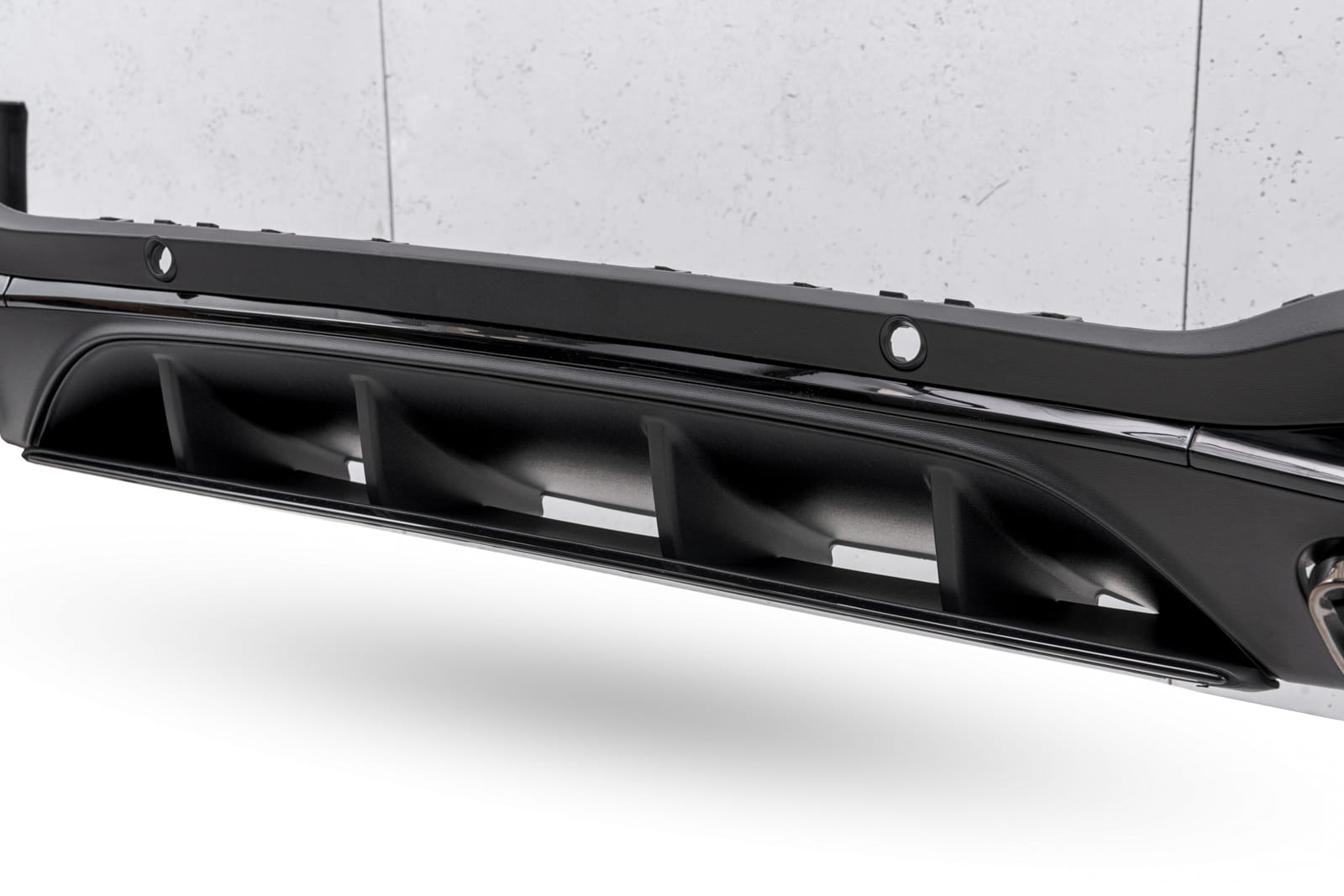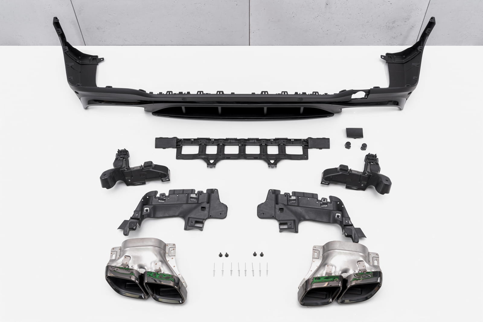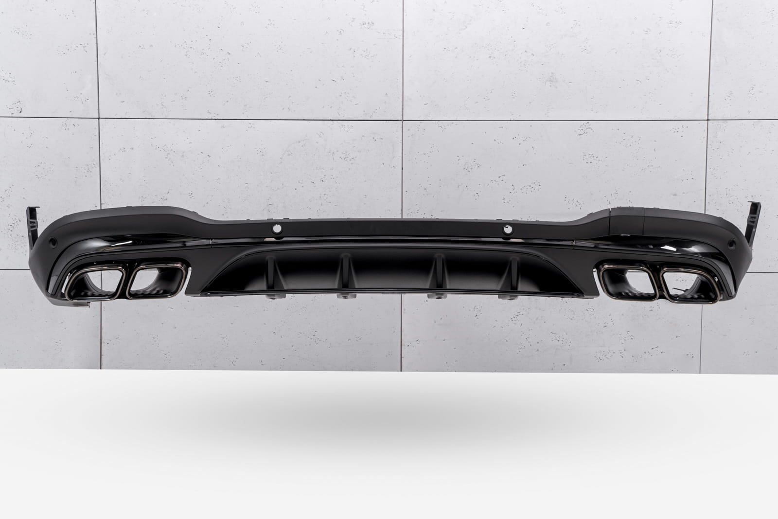 Zestaw stylizujący zaprojektowany został w stylu charakterystycznym dla samochodów z linii AMG. Prawdziwym atutem zestawu, są sportowe końcówki wydechu wykonane ze stali nierdzewnej. Dyfuzor i ozdobne końcówki wydechu wykonano z najwyższej jakości tworzywa motoryzacyjnego w kolorze Piano Black. Zestaw zachwyca sportowym charakterem, a połysk czarnych elementów dodaje mu elegancji - dzięki czemu doskonale współgra z imponującym designem MERCEDESA GLC.