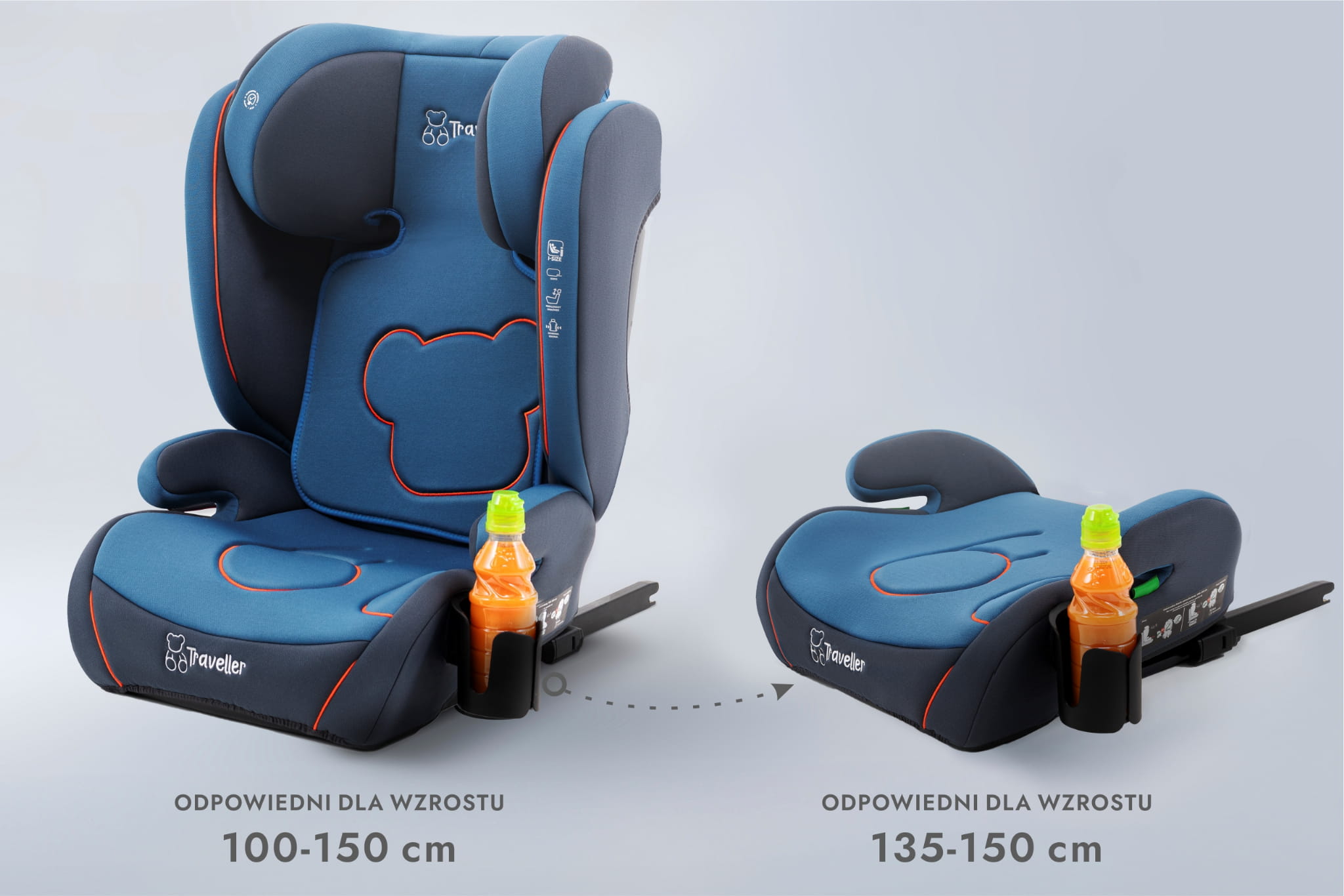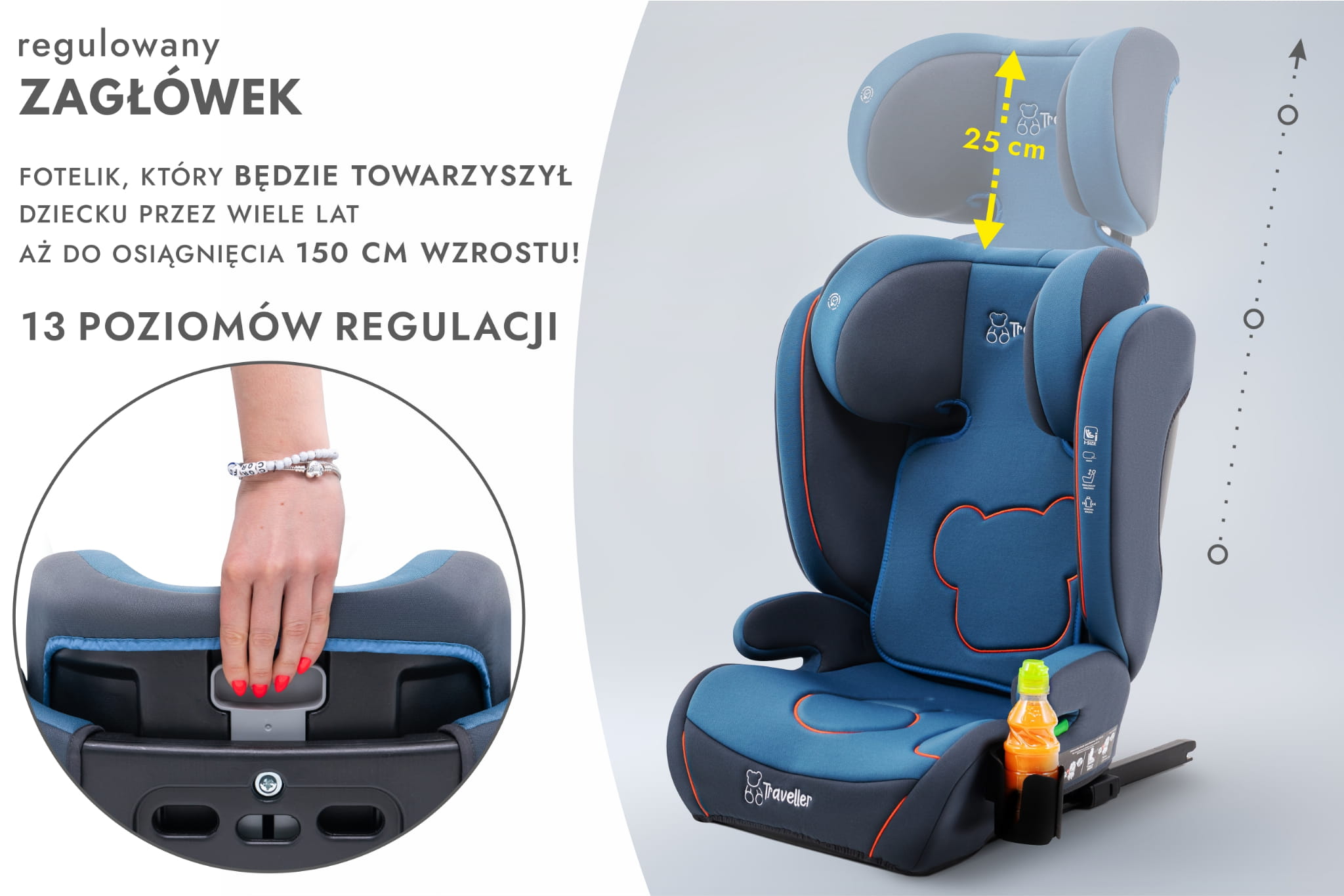 Fotelik rośnie razem z dzieckiem i może być użytkowany do momentu osiągnięcia 150 cm wzrostu (ok. 12 roku życia).
