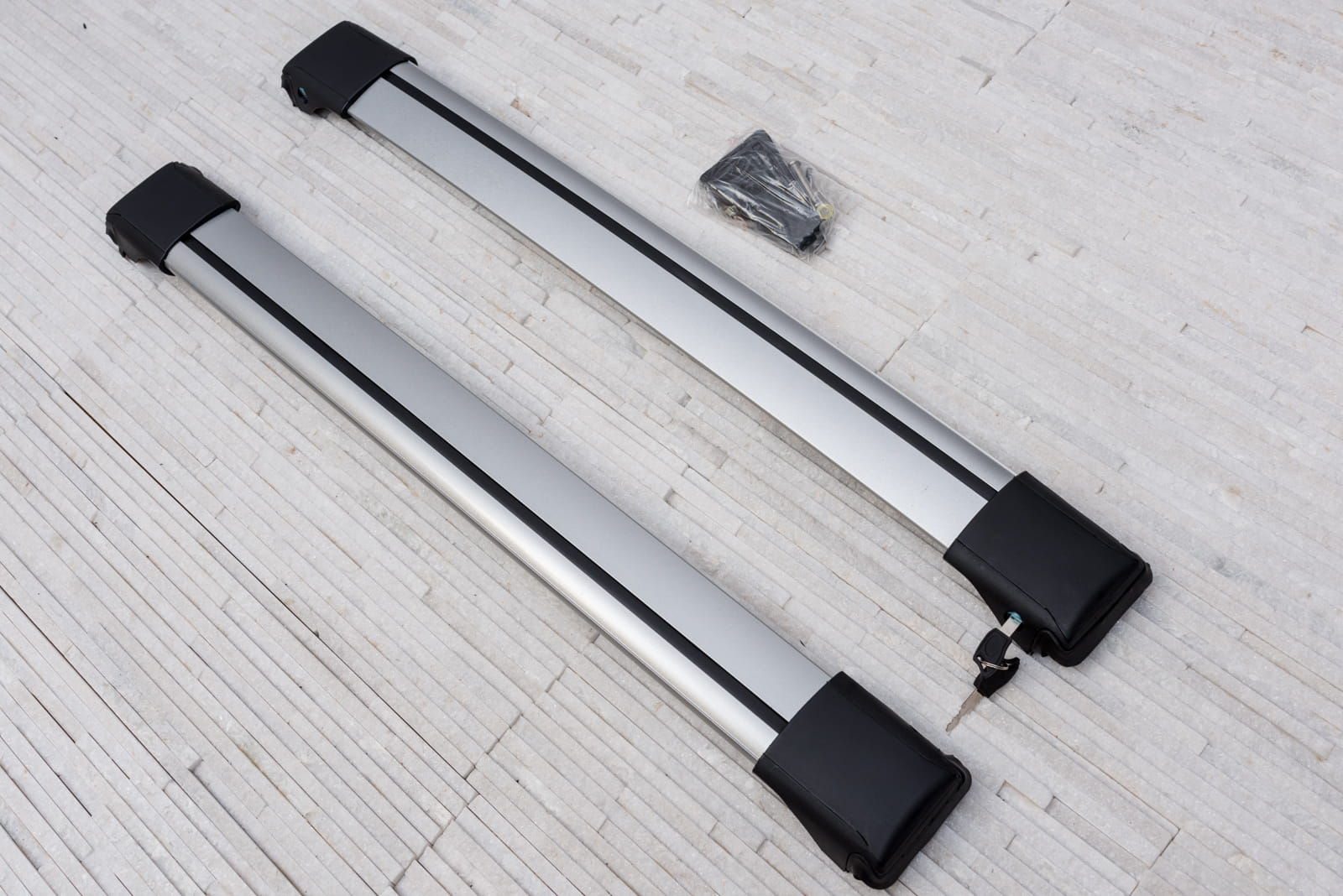 Produkt fabrycznie nowy, oryginalnie zapakowany, w kolorze srebrnym. W komplecie znajdują się: dwie belki oraz dwa kluczyki.