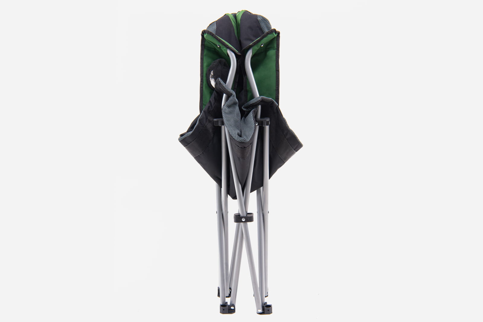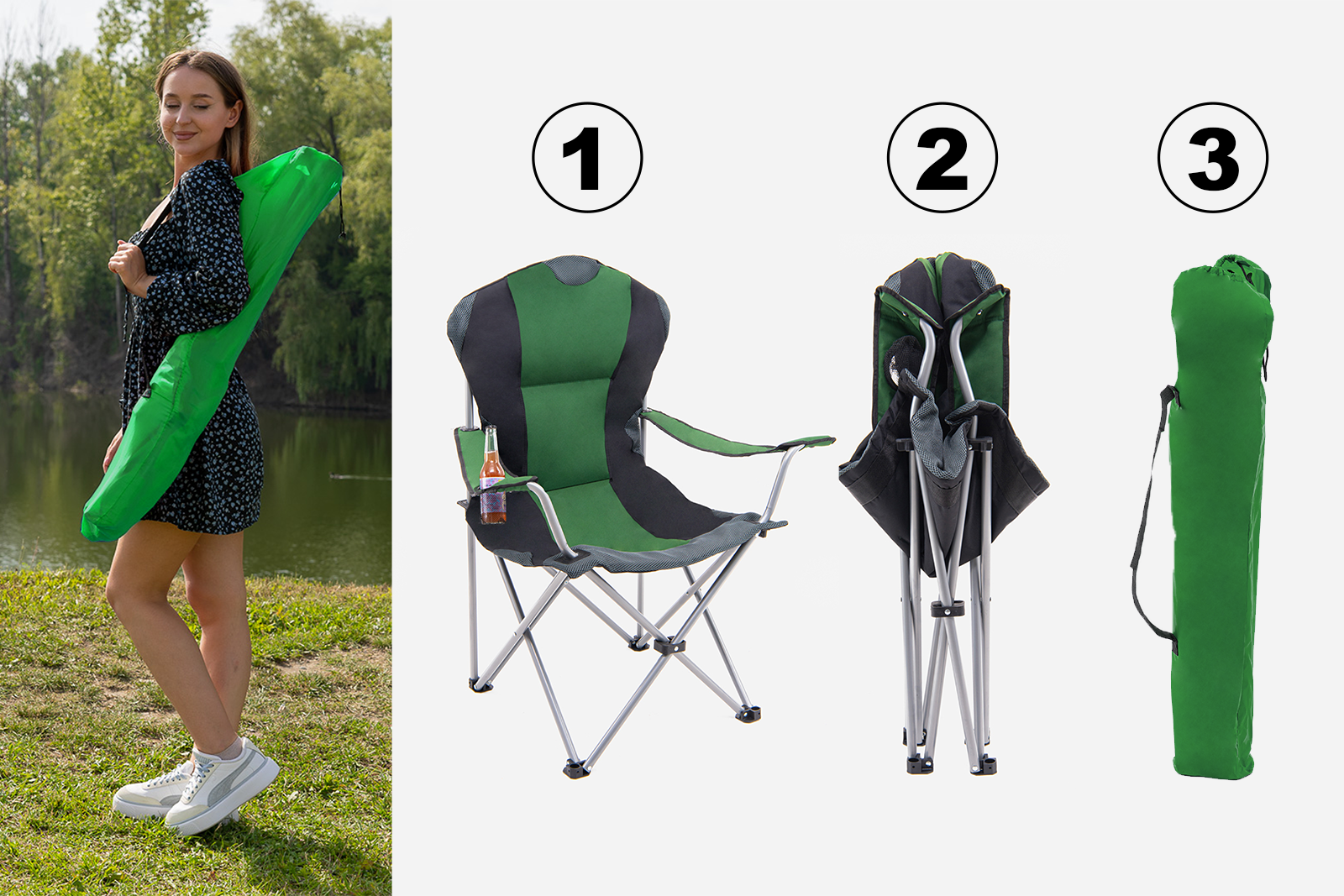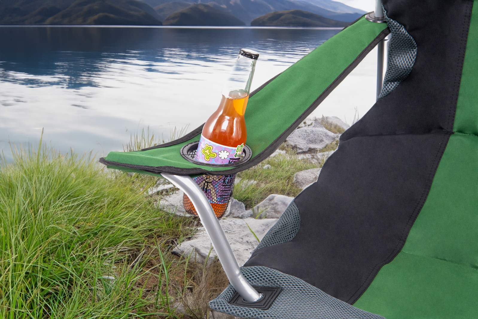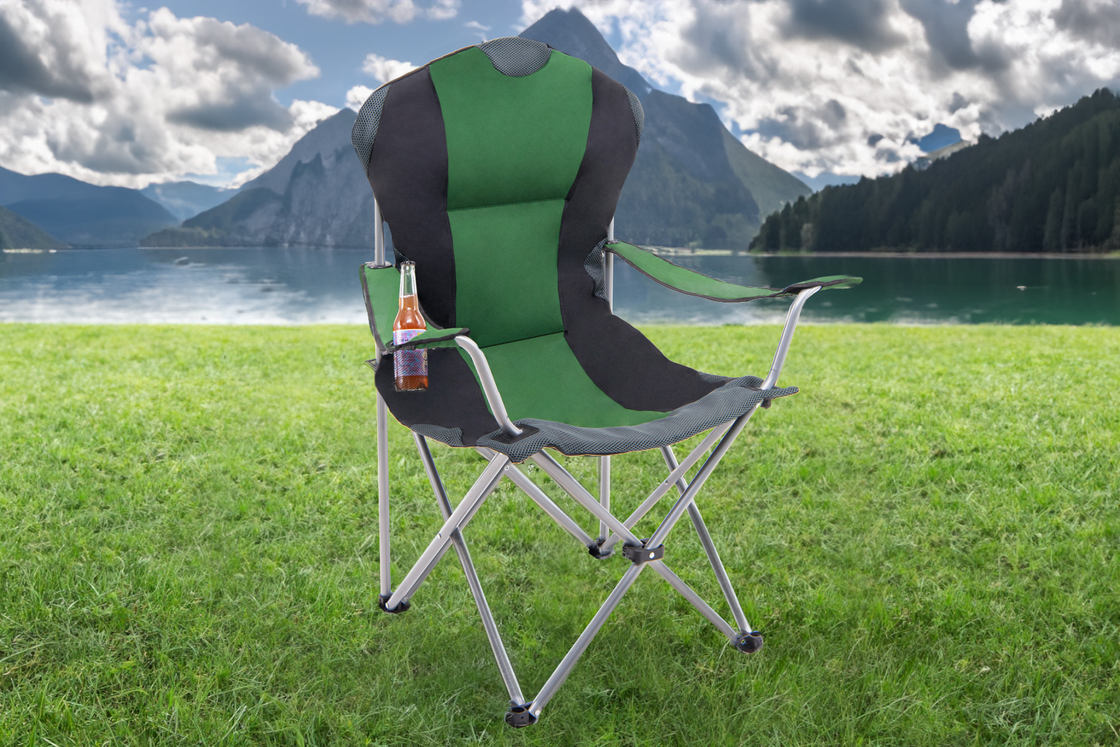 Składane, komfortowe krzesło turystyczne z uchwytem na butelkę w kolorze czarno-zielonym.