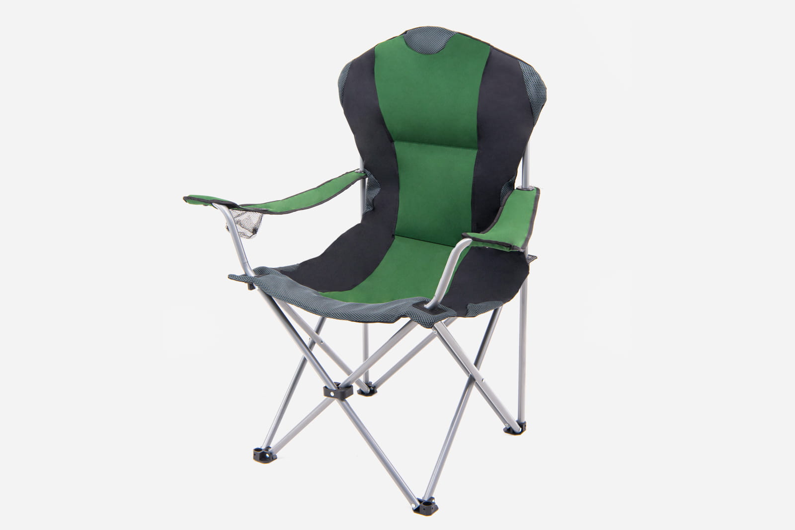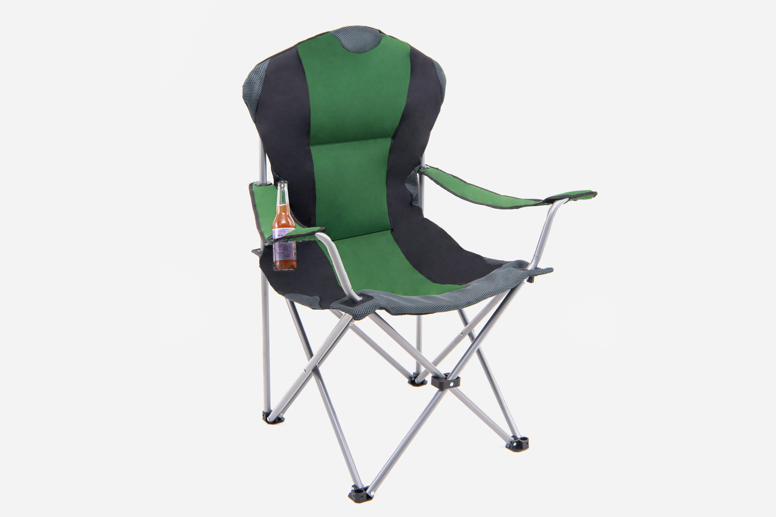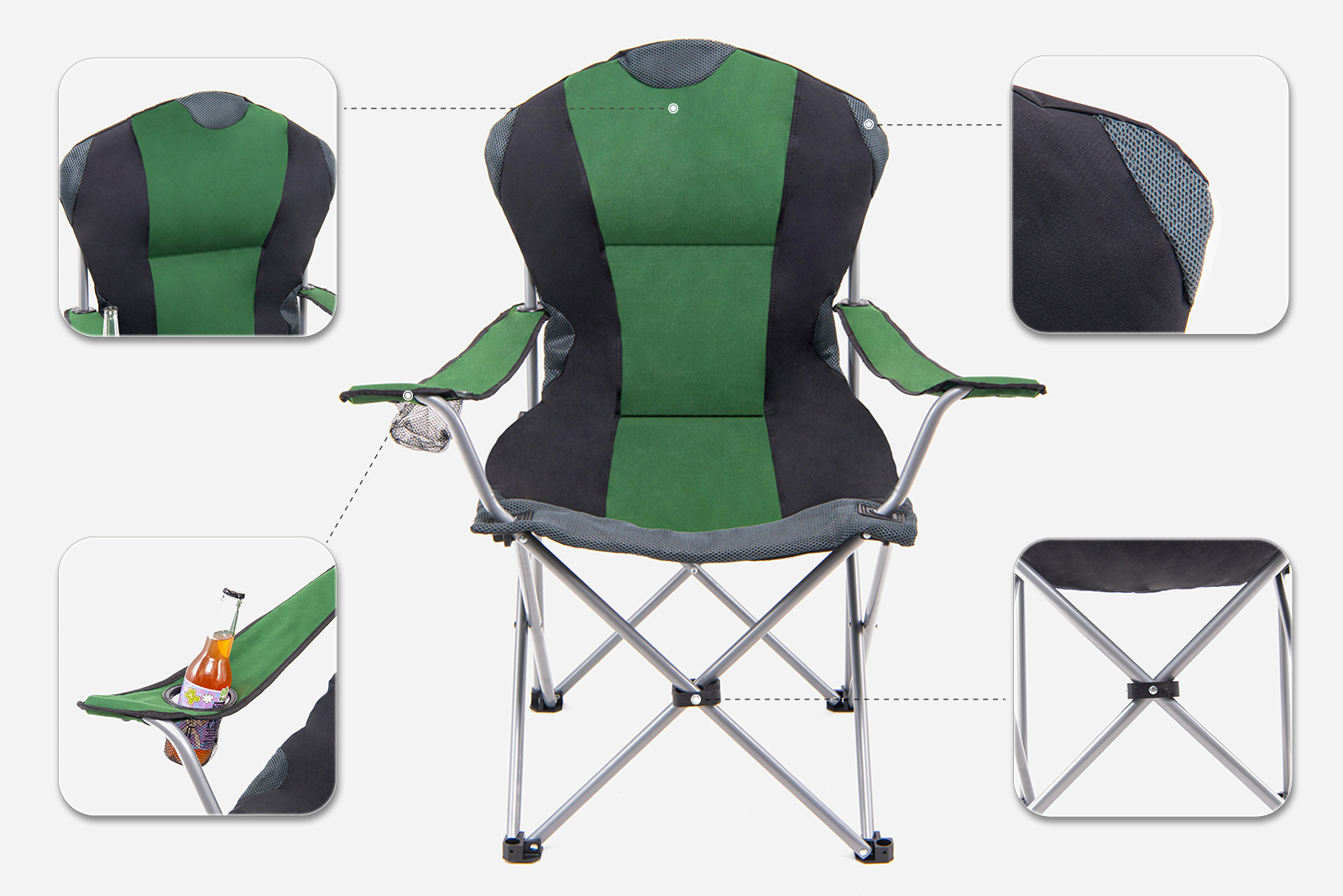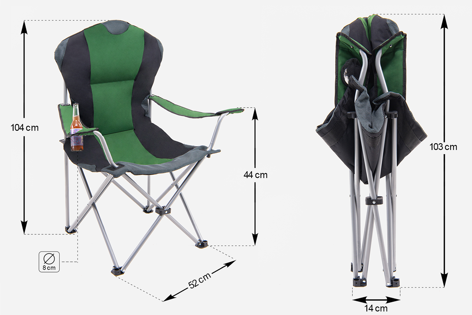 Składane, komfortowe krzesło turystyczne z uchwytem na butelkę w kolorze czarno-zielonym.