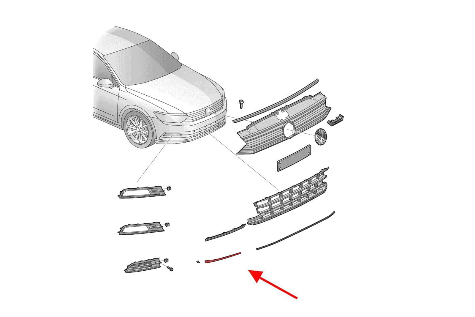 Chromowana listwa przedniego zderzaka, prawa, dla VW PASSAT B8 (3G) 2015-2019 (przed faceliftingiem).