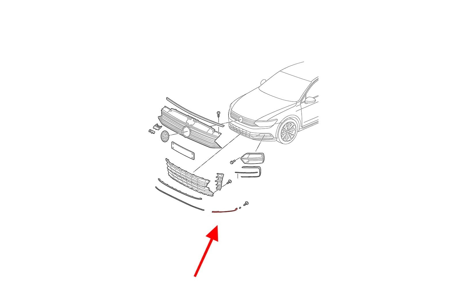 Chromowana listwa przedniego zderzaka, lewa, dla VW PASSAT B8 (3G) R-LINE HIGHLINE 2015-2019 (wersja przed faceliftingiem).