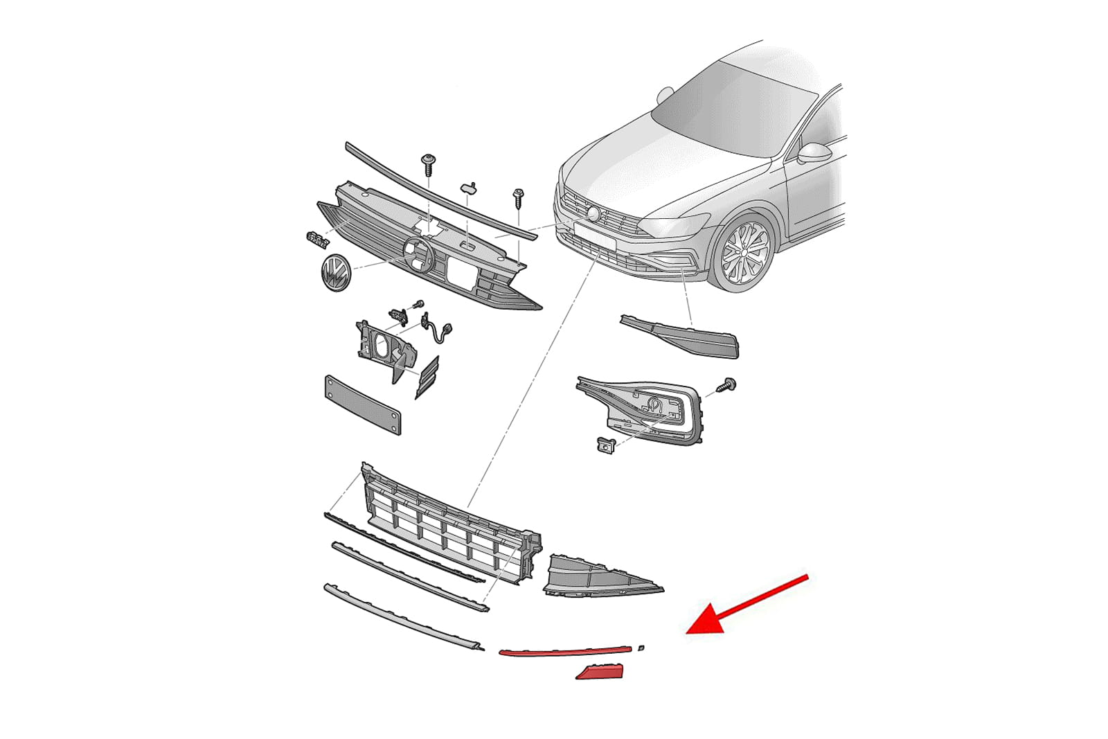 Chromowana listwa przedniego zderzaka, lewa, dla VOLKSWAGEN PASSAT B8 R-LINE 2019-2022.