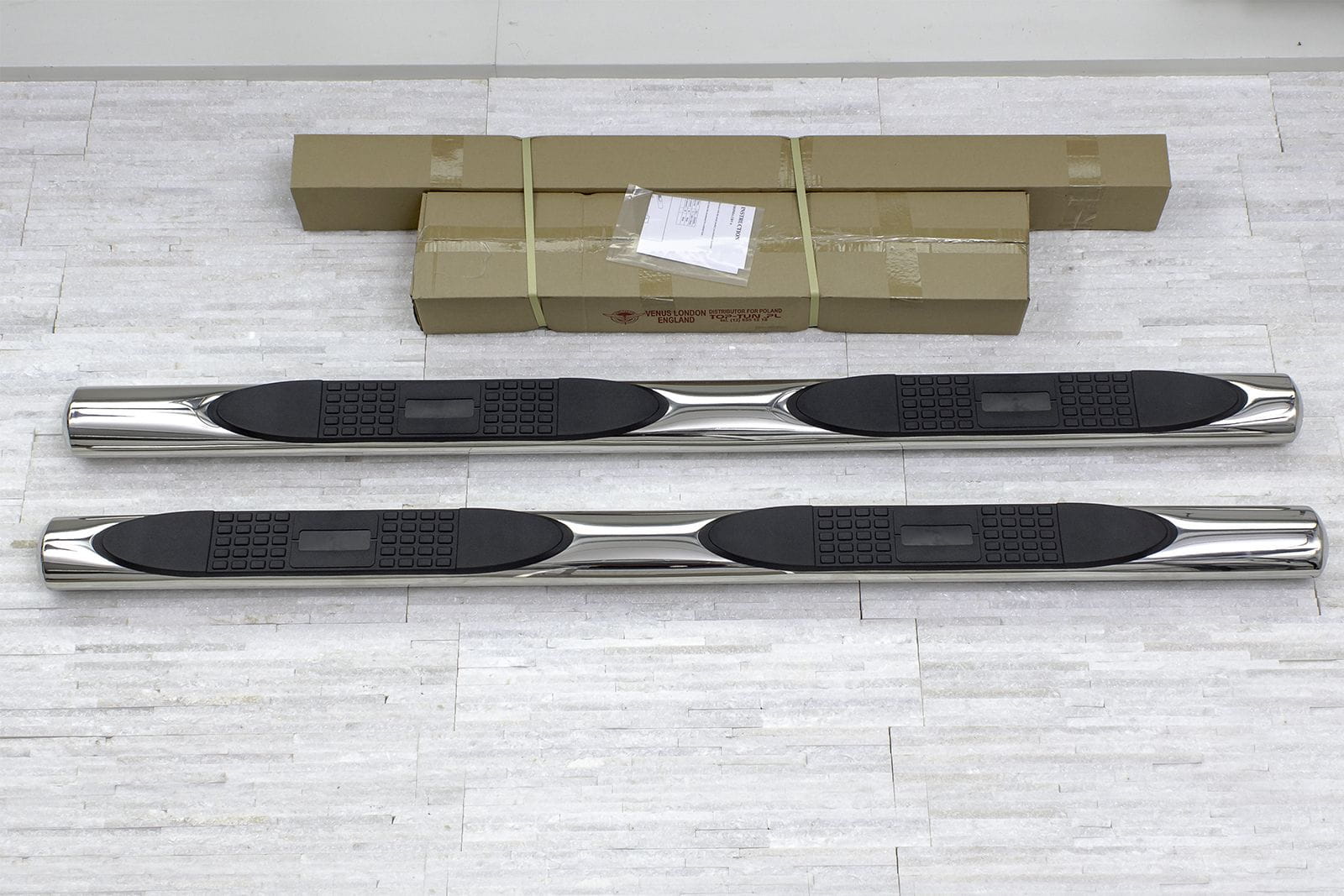 W zestawie znajduje się komplet stopni bocznych (prawy i lewy), elementy montażowe oraz instrukcja. Rury montowane są na fabrycznych punktach montażowych, ich montaż nie wymaga więc wiercenia dodatkowych otworów! Zalecamy profesjonalny montaż w warsztacie (z doświadczenia wiemy że najlepiej skorzystać z usług zakładu lakierniczego lub blacharskiego ponieważ to te zakłady zajmują się najczęściej montażem listew, dokładek oraz stopni, więc montaż dla tych zakładów jest czynnością intuicyjną).
