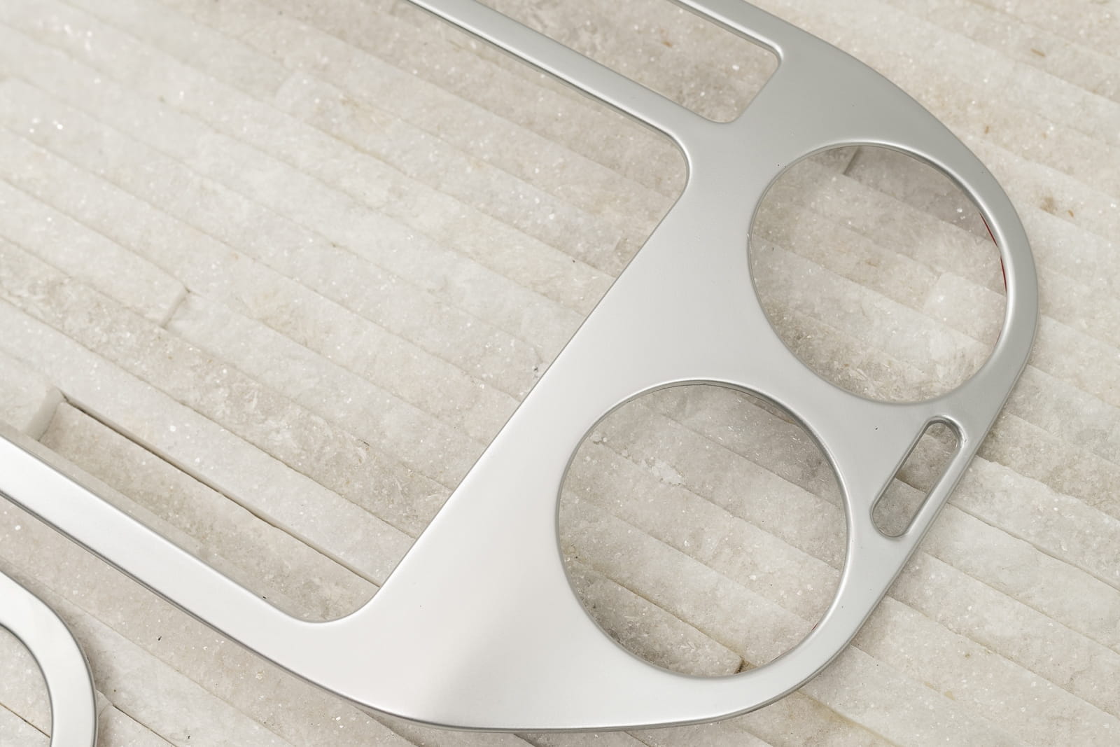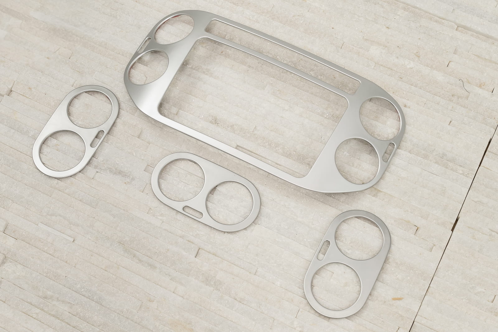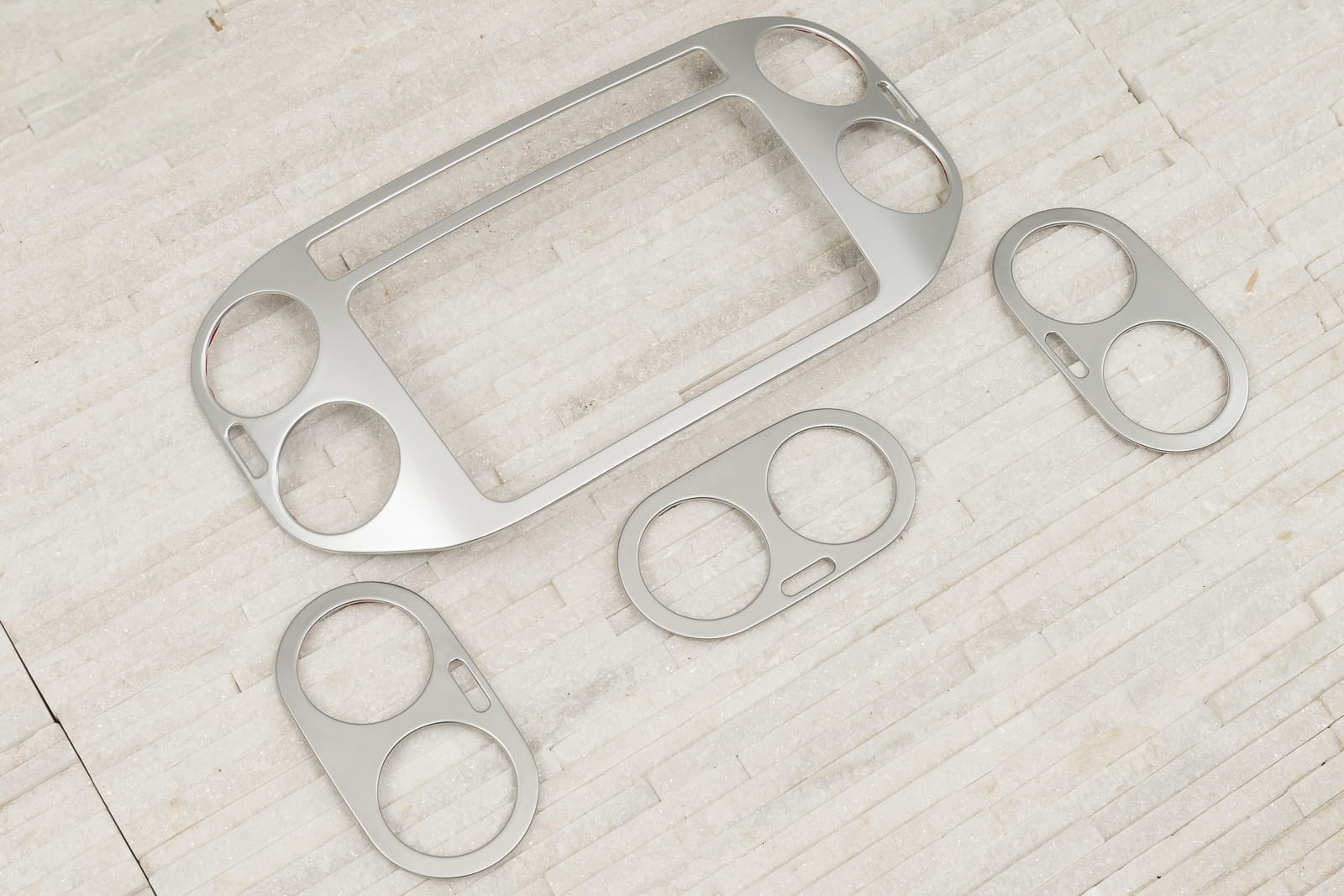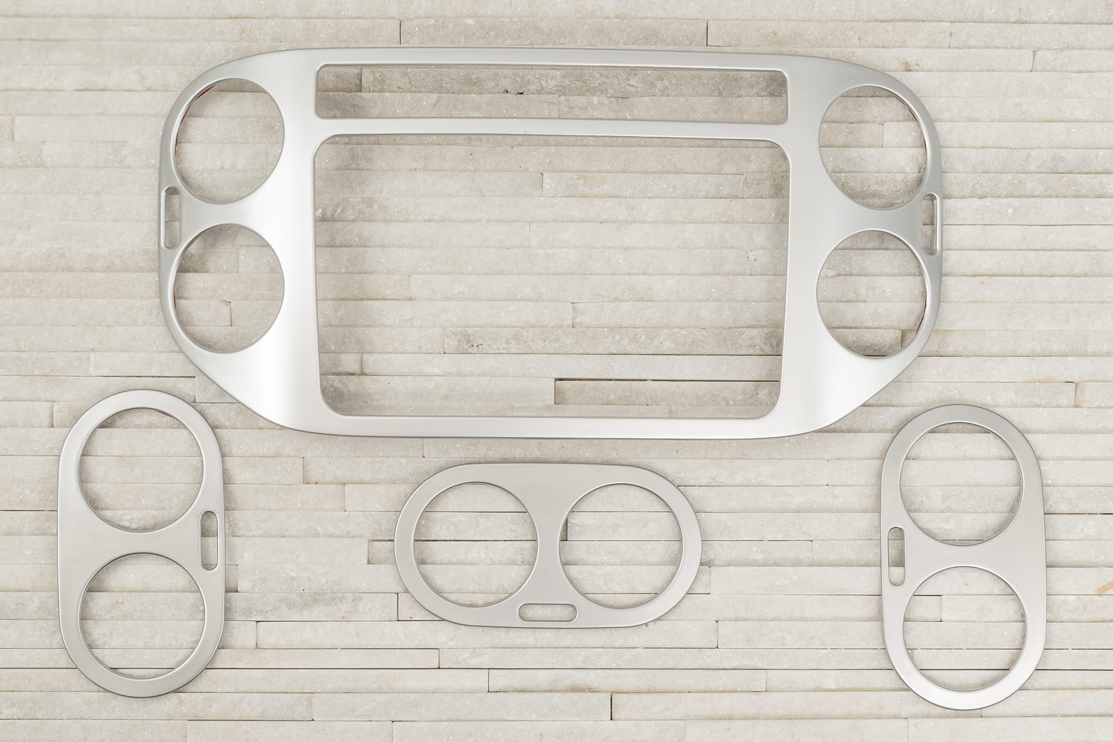 Ozdobne, satynowe nakładki na radio i wyloty powietrza, dedykowane do VOLKSWAGEN TIGUAN I (5N) 2010-2016 (wersja po faceliftingu).