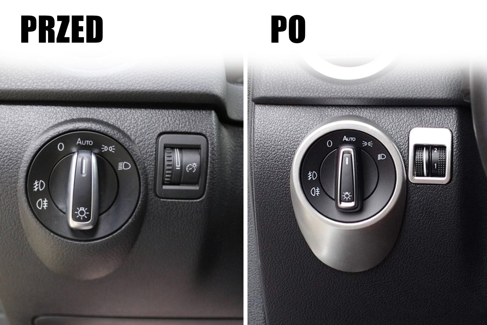 Ozdobna, satynowa ramka włączników świateł w kabinie, dla VOLKSWAGEN TIGUAN I (5N) 2010-2016 (wersja po faceliftingu).