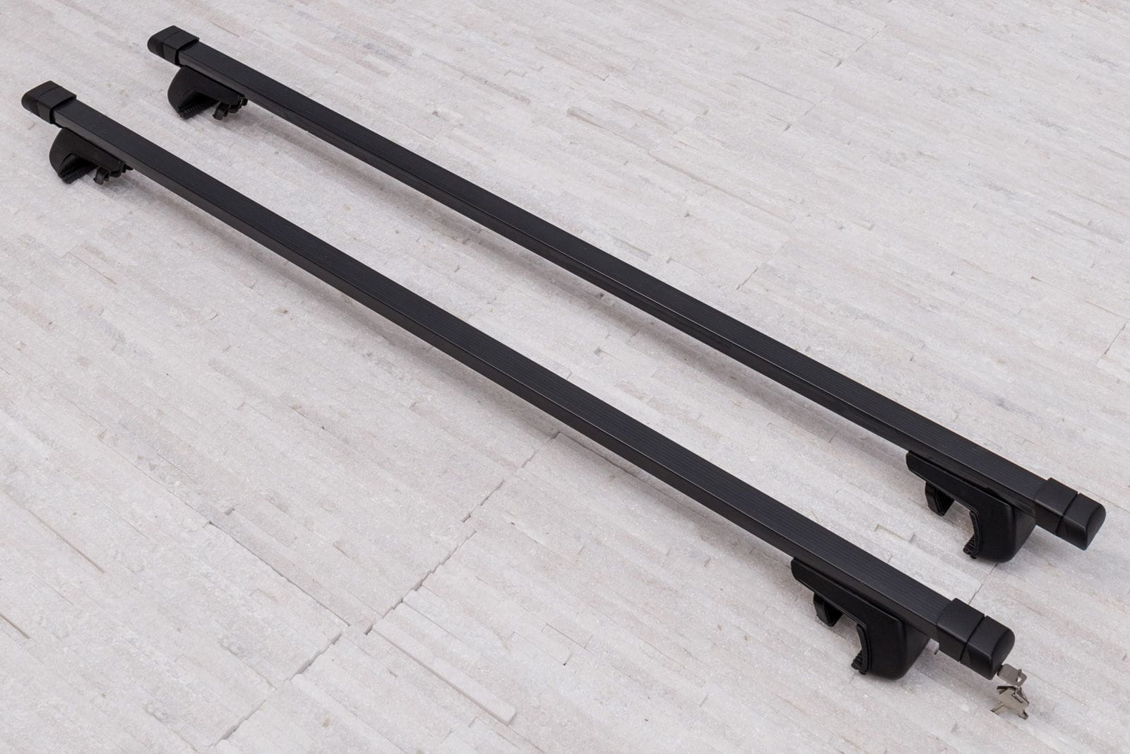 W komplecie znajdują się: dwie belki stalowe i cztery zaciski i system zabezpieczenia z kluczykami.
