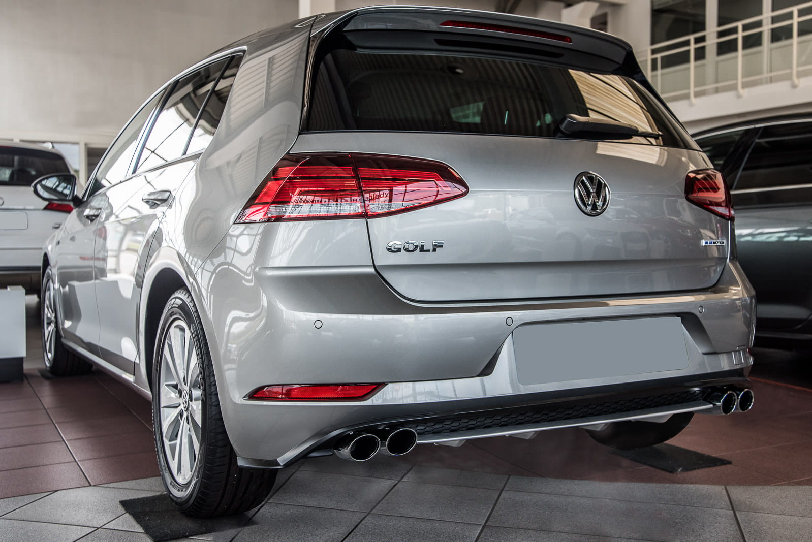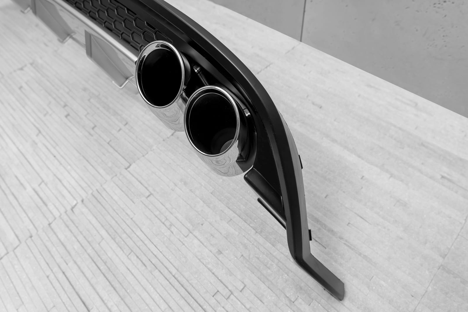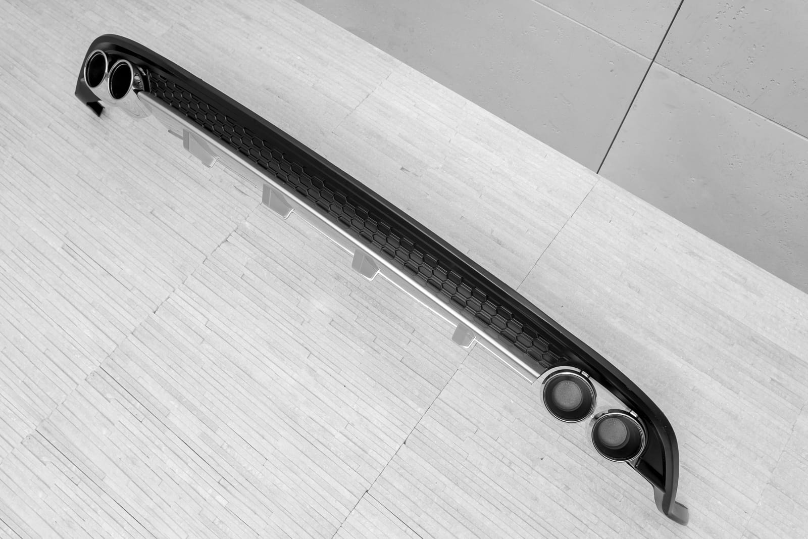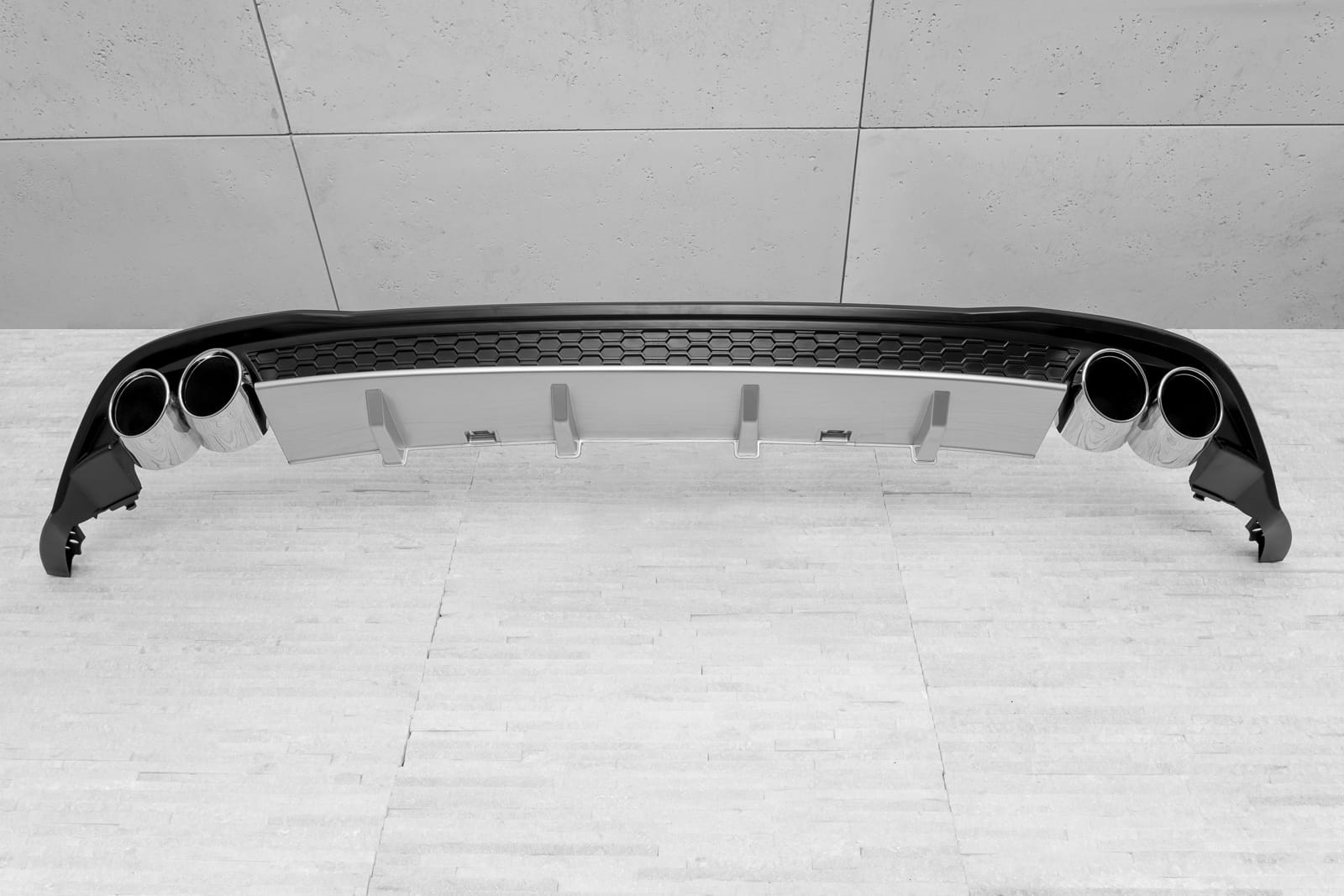 Dyfuzor tylnego zderzaka z imitacją podwójnego wydechu dla modelu VOLKSWAGEN GOLF 7 VII 2016-2020 (wersja po faceliftingu). Charakterystyczny, podwójny wydech pozwala osiągnąć efekt stylizacji Golfa 7 na model Golf 7R.