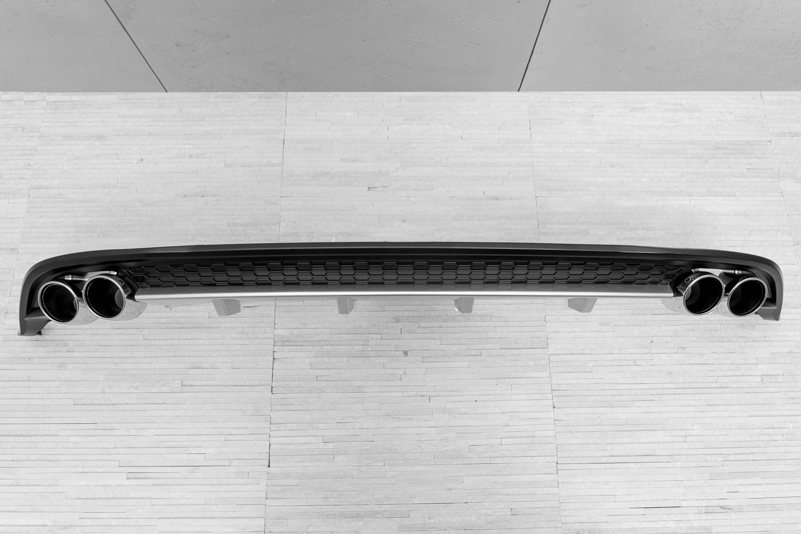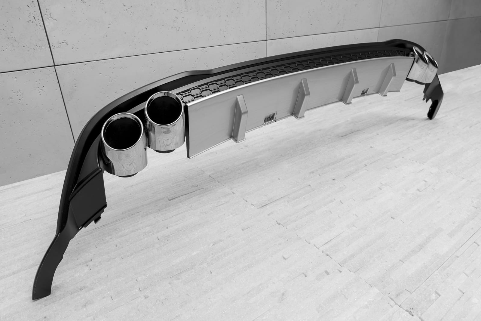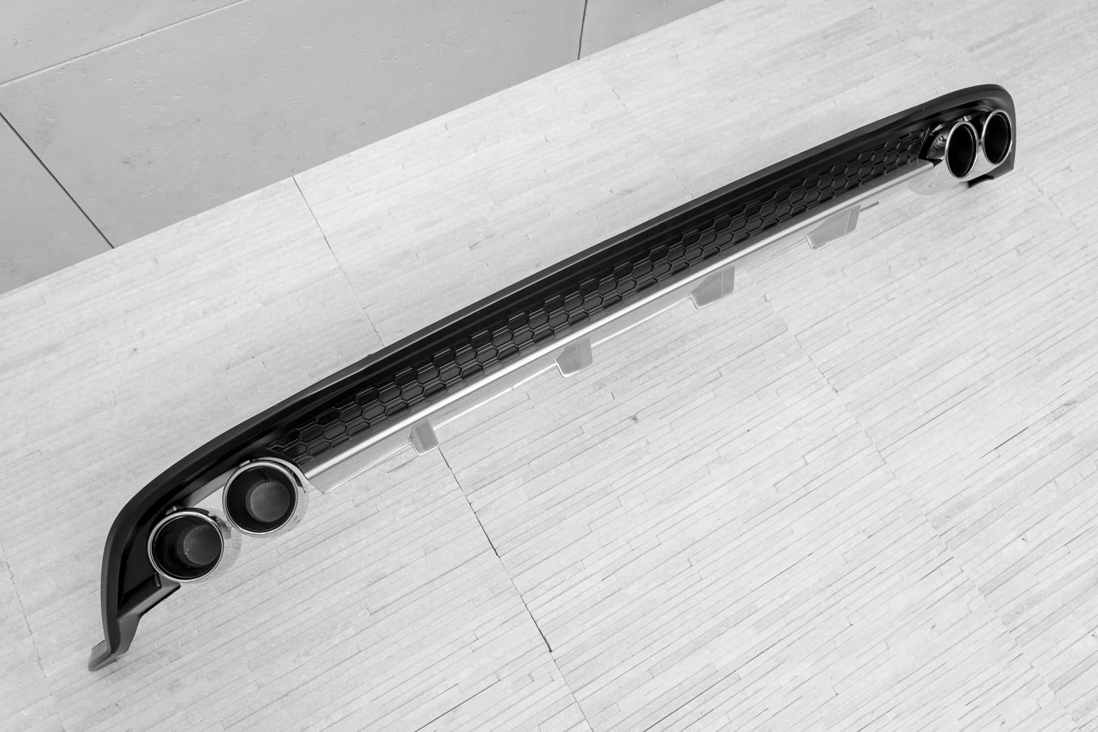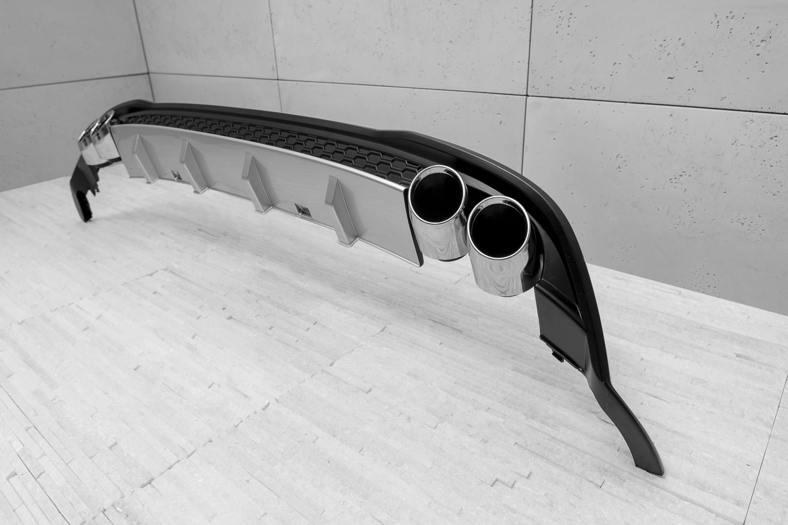 Produkt wykonany został z wysokiej jakości tworzywa motoryzacyjnego ABS w kolorze czarnym o błyszczącym wykończeniu. Prawdziwą ozdobą dyfuzora są zawarte w zestawie chromowane imitacje wydechu, przyciągające wzrok lustrzanym połyskiem. Dyfuzor dodatkowo zdobi wzmocnienie o strukturze plastra miodu, nawiązujące stylem do sportowych samochodów.