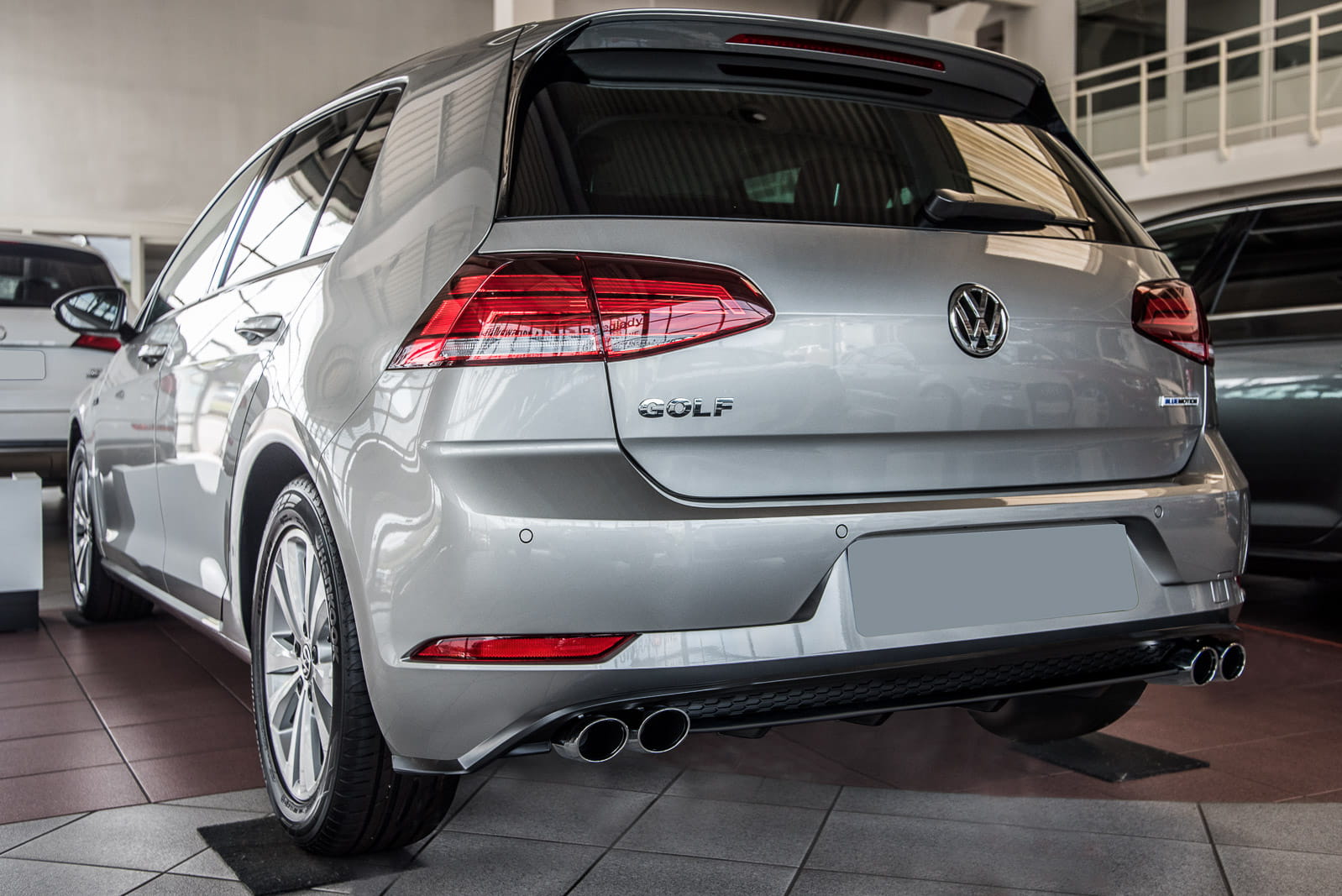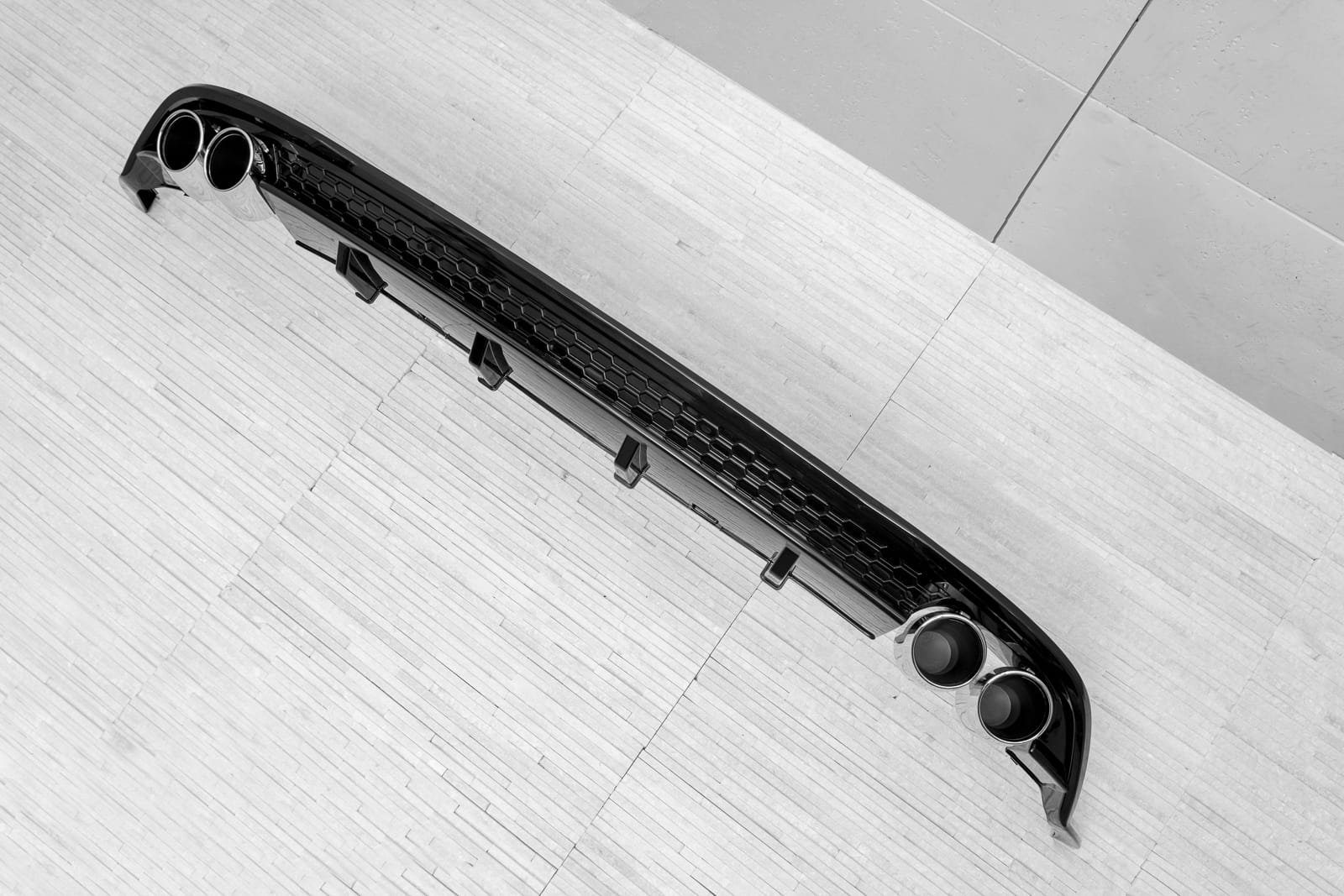 Dyfuzor tylnego zderzaka z imitacją podwójnego wydechu dla modelu VOLKSWAGEN GOLF 7 VII 2016-2020 (wersja po faceliftingu). Charakterystyczny, podwójny wydech pozwala osiągnąć efekt stylizacji Golfa 7 na model Golf 7R.