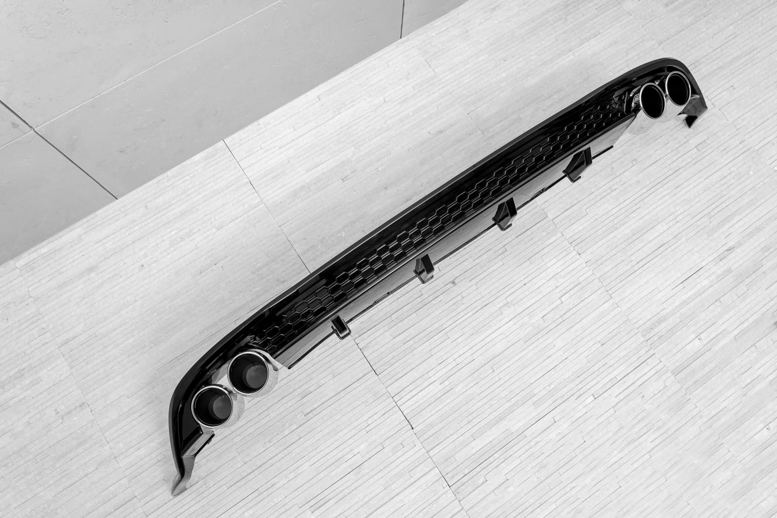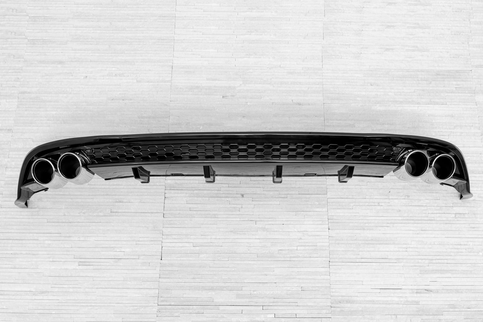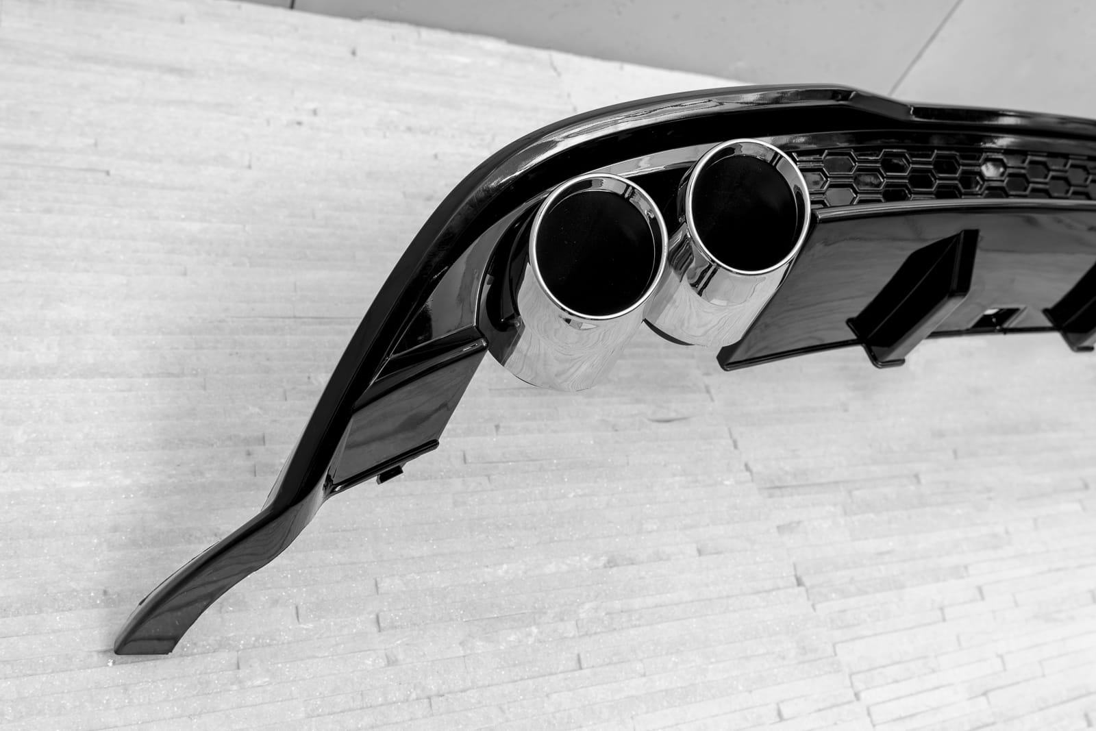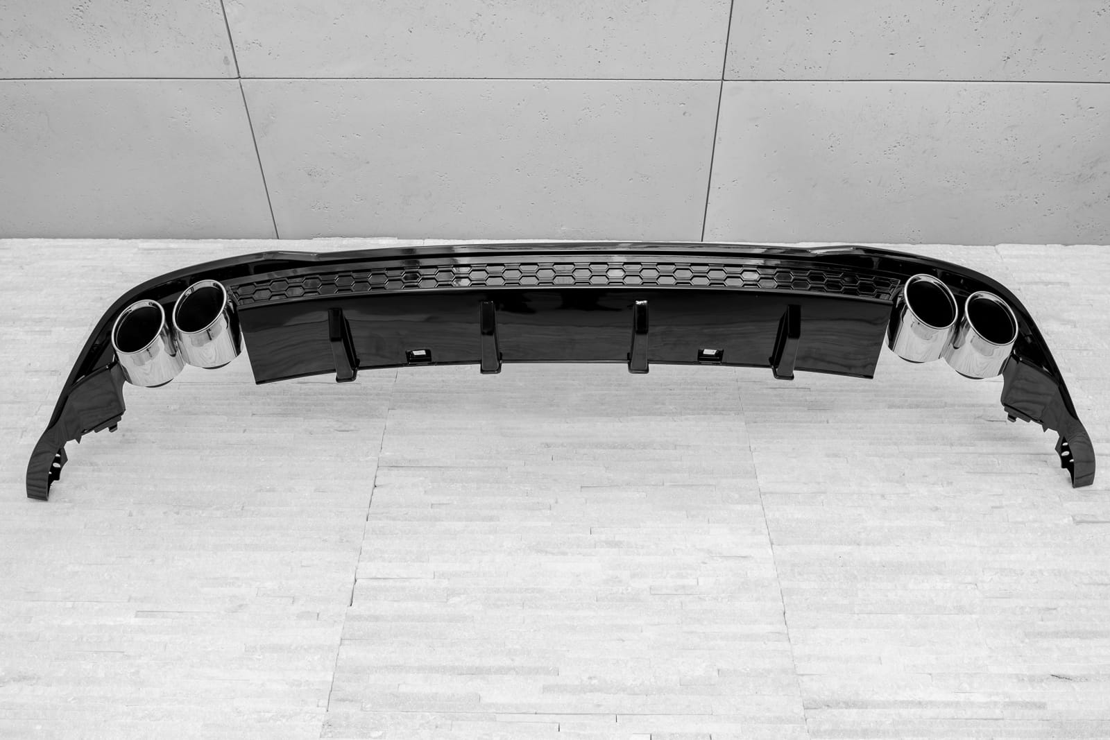 Produkt wykonany został z wysokiej jakości tworzywa motoryzacyjnego ABS w kolorze czarnym o błyszczącym wykończeniu. Prawdziwą ozdobą dyfuzora są zawarte w zestawie chromowane imitacje wydechu, przyciągające wzrok lustrzanym połyskiem. Dyfuzor dodatkowo zdobi wzmocnienie o strukturze plastra miodu, nawiązujące stylem do sportowych samochodów.