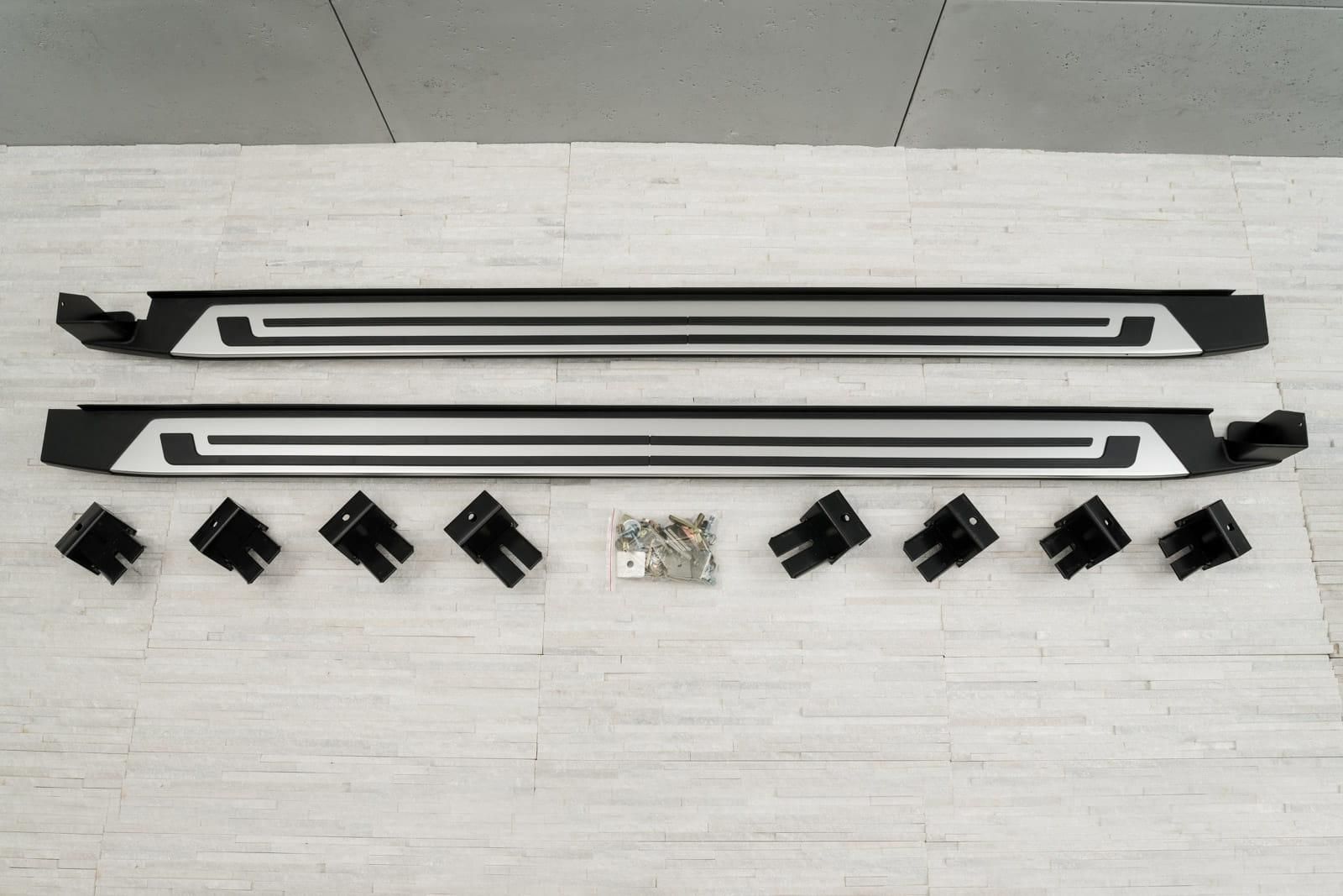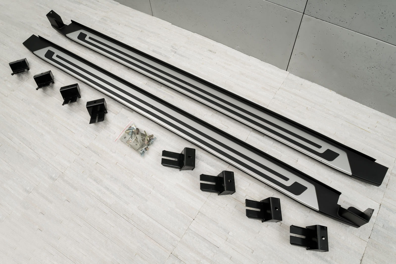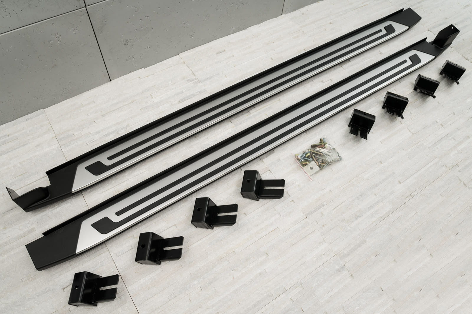 W zestawie komplet stopni bocznych (prawy i lewy), elementy montażowe oraz instrukcja. Progi montowane są na fabrycznych punktach montażowych. Montaż stopni nie wymaga wiercenia dodatkowych otworów! Zalecamy profesjonalny montaż w warsztacie (z doświadczenia wiemy że najlepiej skorzystać z usług zakładu lakierniczego lub blacharskiego ponieważ to te zakłady zajmują się najczęściej montażem listew, dokładek oraz stopni, więc montaż dla tych zakładów jest czynnością intuicyjną).